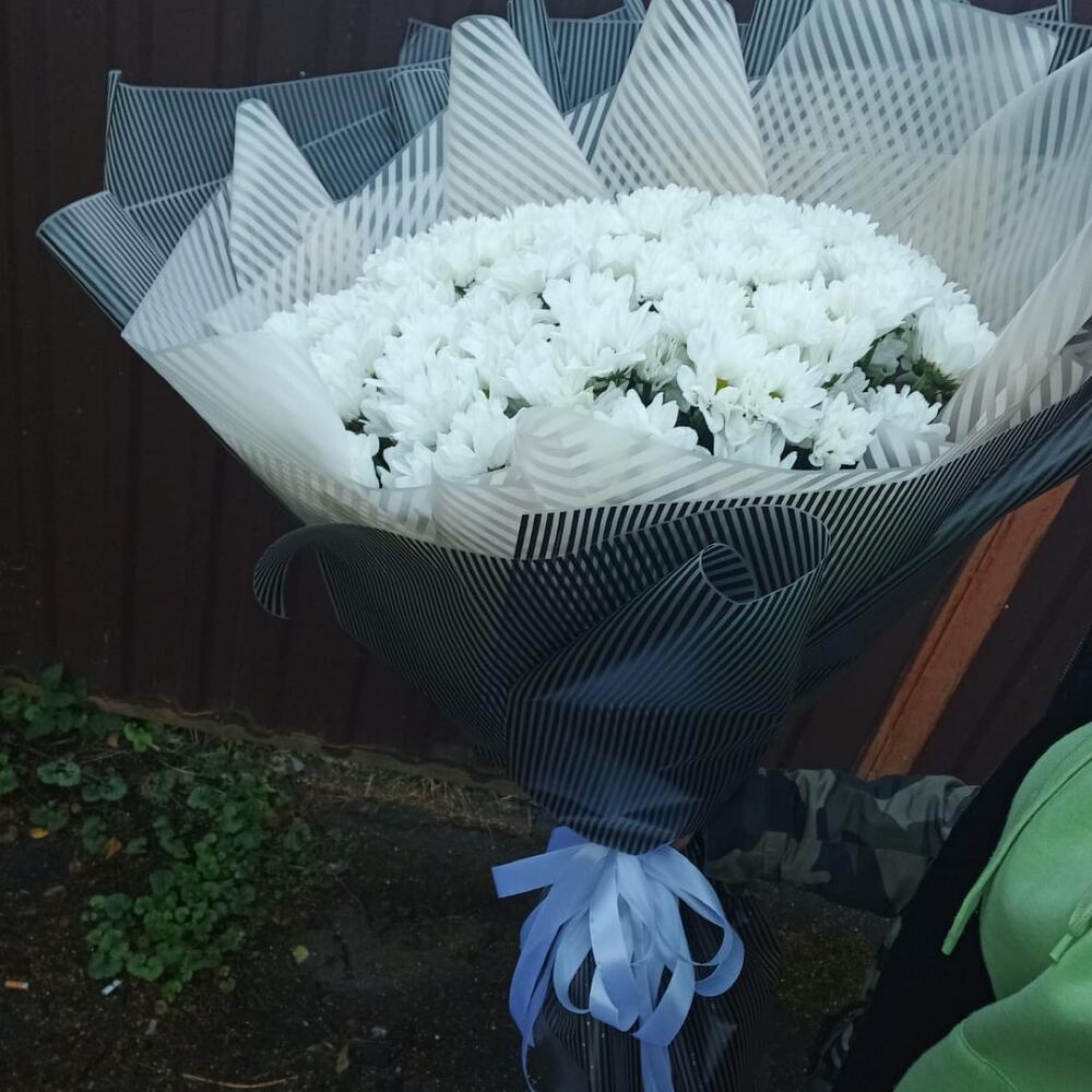 Лента атласная – 2 шт.Упаковка дизайнерская – 1 шт.хризантема кустовая кеннеди – 25 шт.