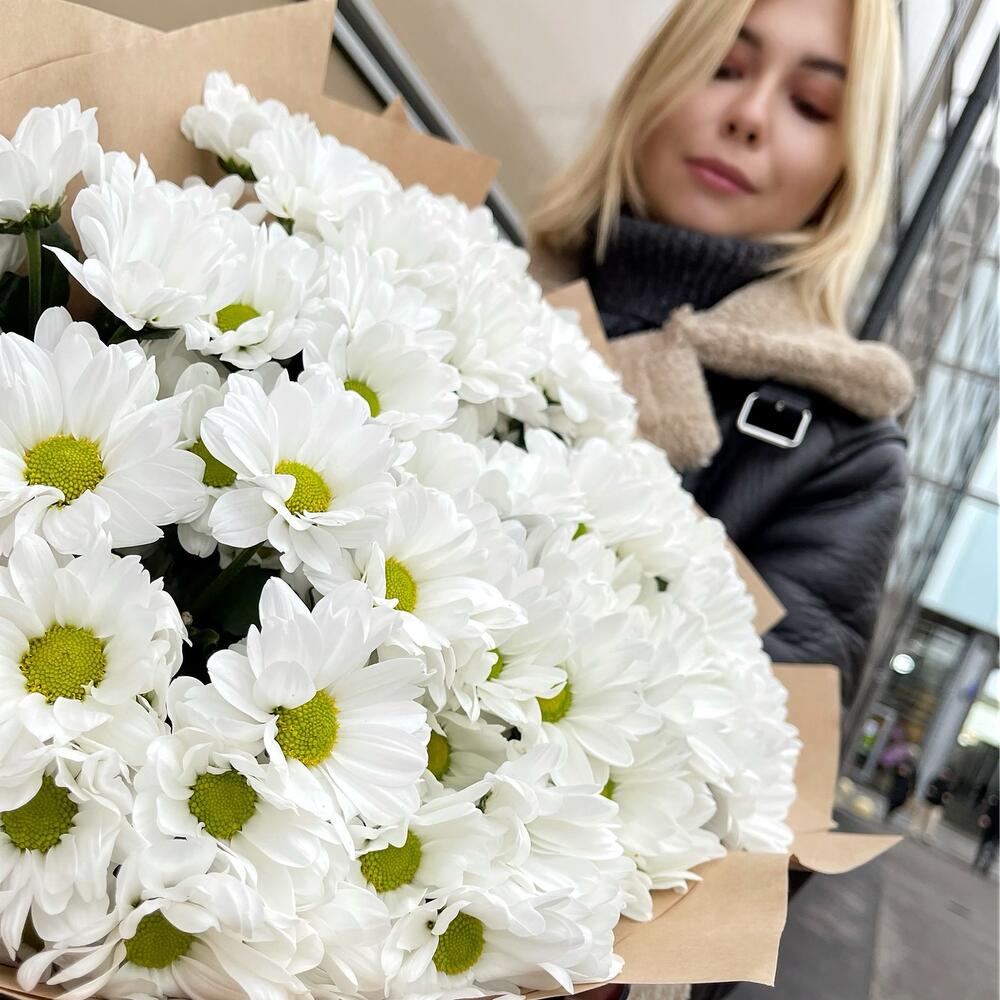 Хризантема кустовая – 17 шт.Лента атласная – 1 шт.Крафт упаковка – 1 шт.