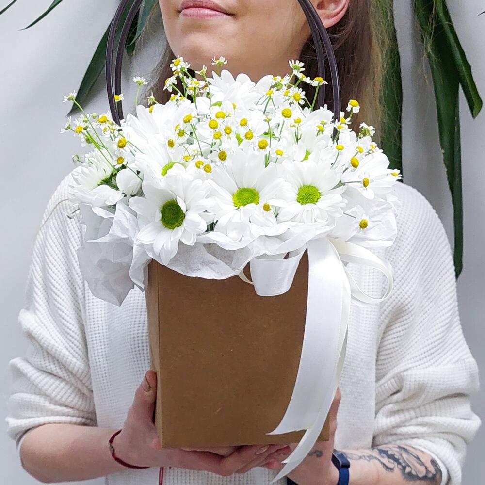 Цветы в коробке. Летняя композиция в коробке-сумочке с ромашками