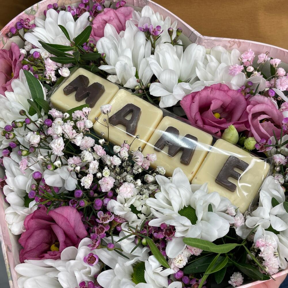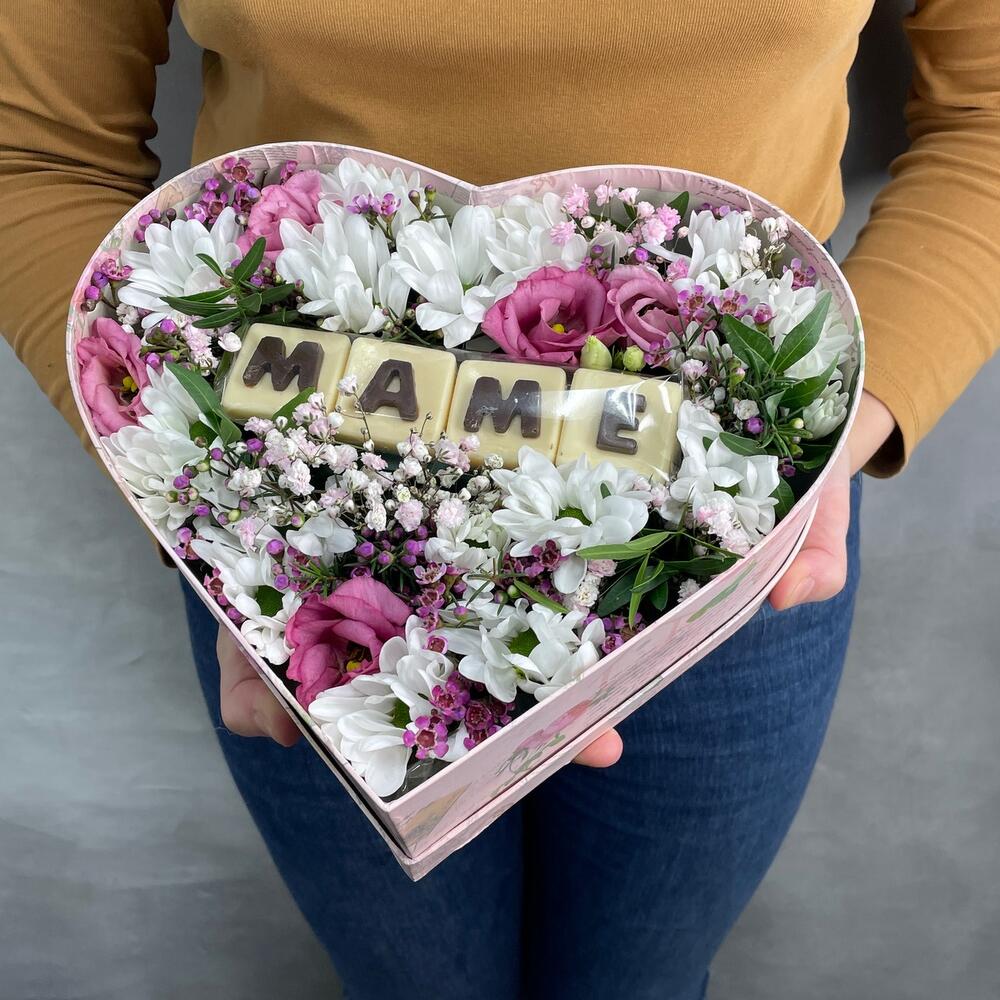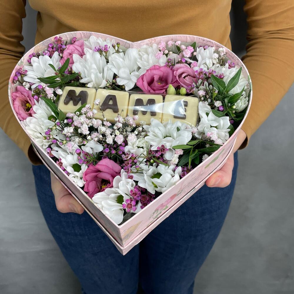 Коробка сердце – 1 шт.Оазис – 1 шт.Буква шоколадная – 4 шт.Хризантема кустовая – 2 шт.Лизиантус – 2 шт.Ваксфлауэр – 1 шт.Гипсофила – 1 шт.Фисташка – 1 шт.