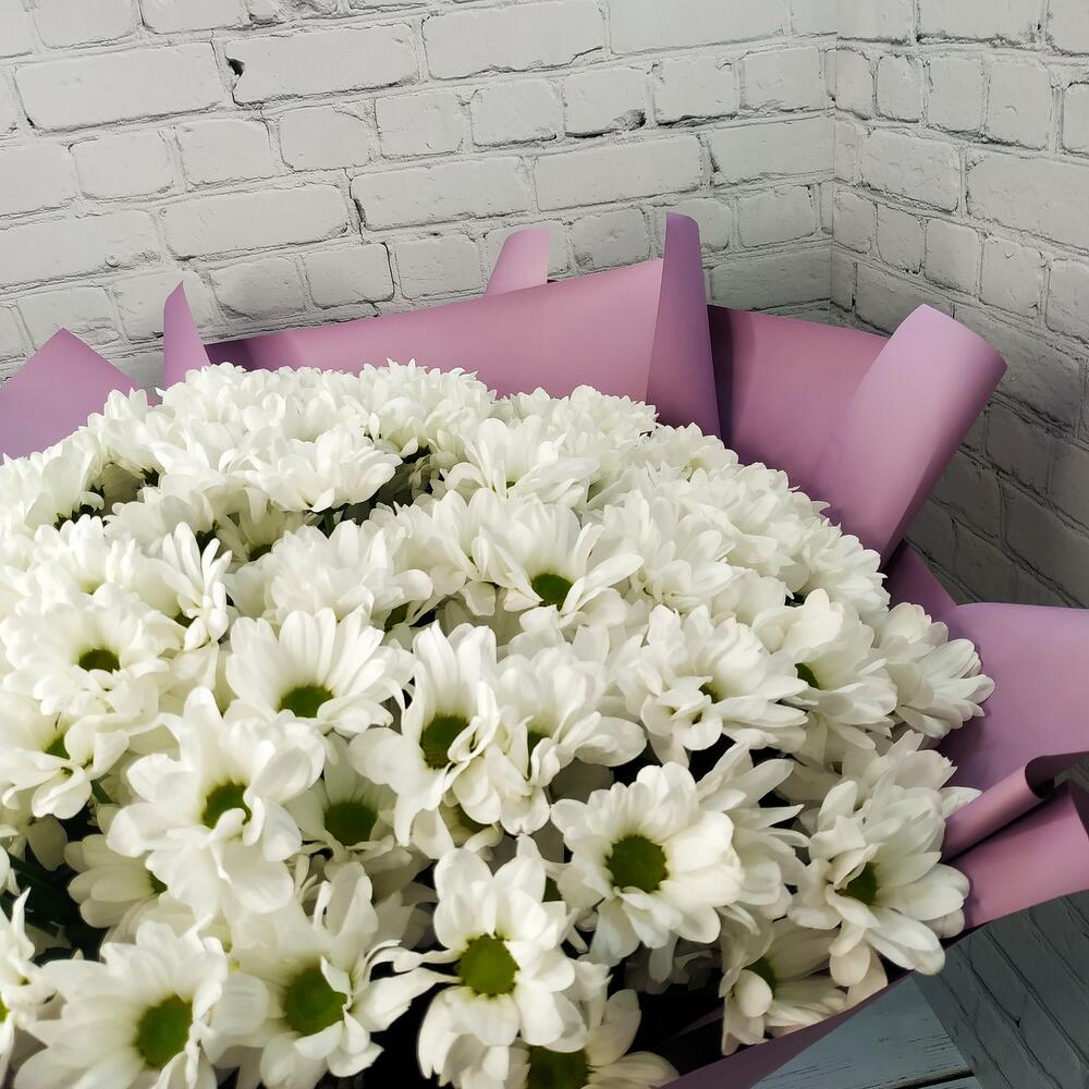 Прекрасный букет из белых хризантем, станет идеальным подарком для самых любимых и близких!Памятка для букета:1. Чистая вода раз в сутки.2. Стебли подрезаем на 0,5см при каждой смене воды.3. Ставим в прохладное место, но не у окна.4. Чтобы вода оставалась свежей, не допускайте попадания листьев и лепестков в воду.Друзья, обратите внимание, что цвет упаковки может быть другим, в зависимости от наличия на складе.