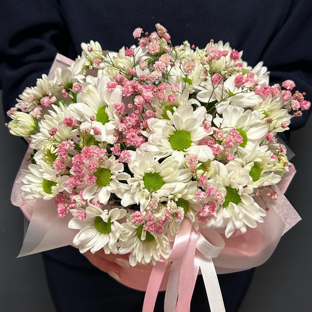 Композиция в коробке из кустовой хризантемой и розовой гипсофилой