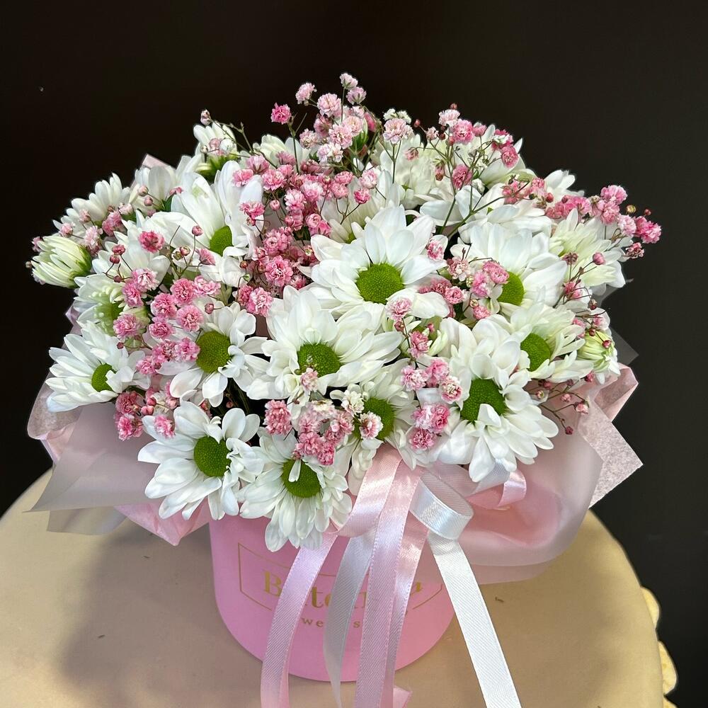 Коробка шляпная – 1 шт.Пиафлор (оазис) – 1 шт.Гипсофила – 3 шт.Хризантема кустовая – 5 шт.