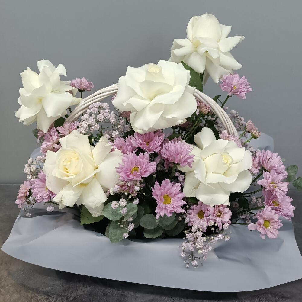 Авторская композиция из шикарных белых французских роз и ромашковых хризантем в изумительной окраске!