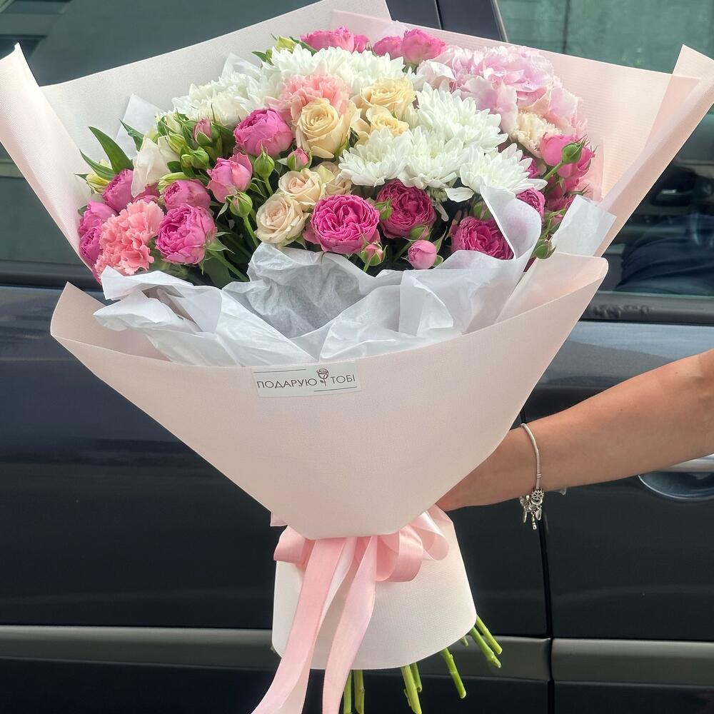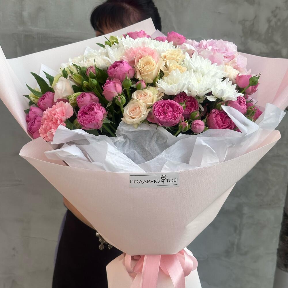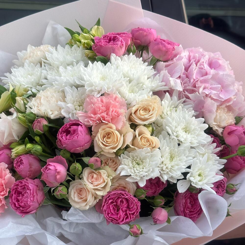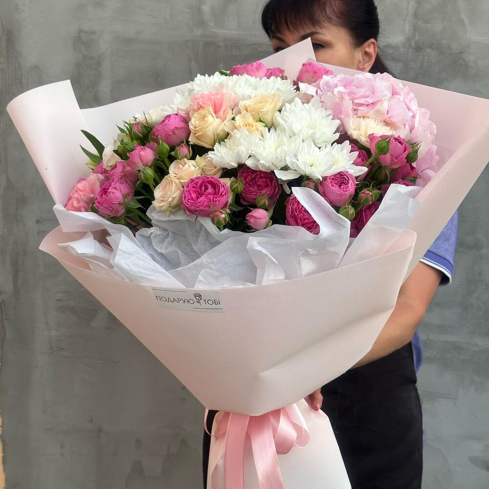 Альстромерии, Гортензии, Кустовые розы, Лизиантусы, Розы, Хризантемы