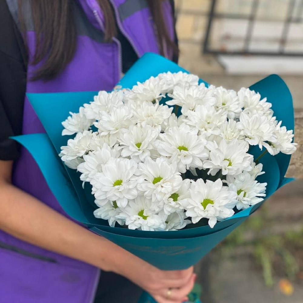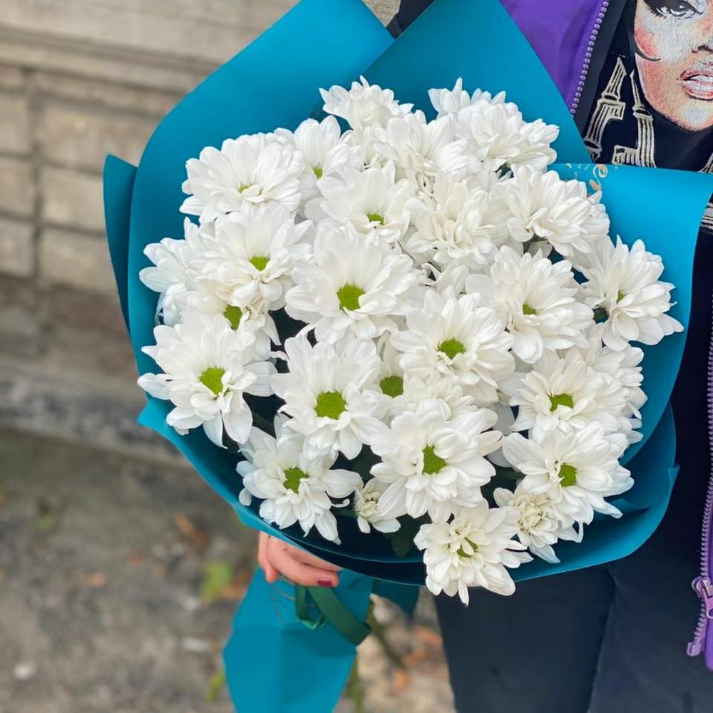 Хризантема кустовая – 7 шт. Лента атласная – 1 шт. Упаковка дизайнерская – 2 шт.