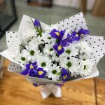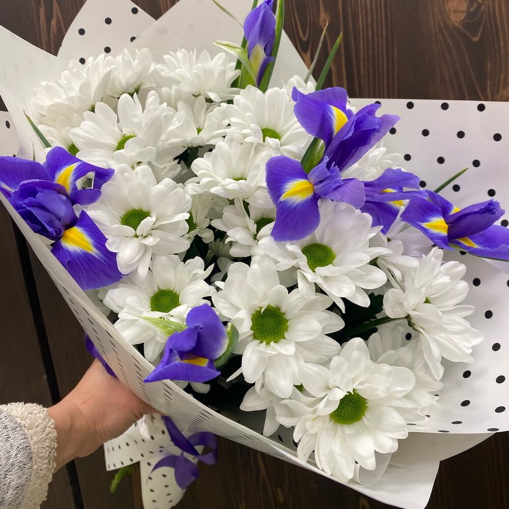 Хризантема кустовая – 4 шт.ирисы – 5 шт.Упаковка дизайнерская – 1 шт.Лента – 1 шт.