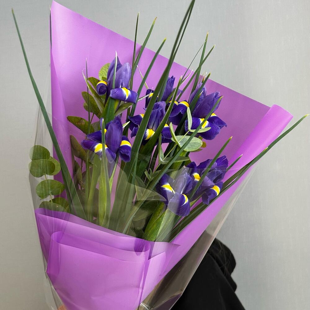 Эвкалипт – 1 шт.Лента атласная – 1 шт.Упаковка дизайнерская – 2 шт.Ирис Blue Magic – 7 шт.