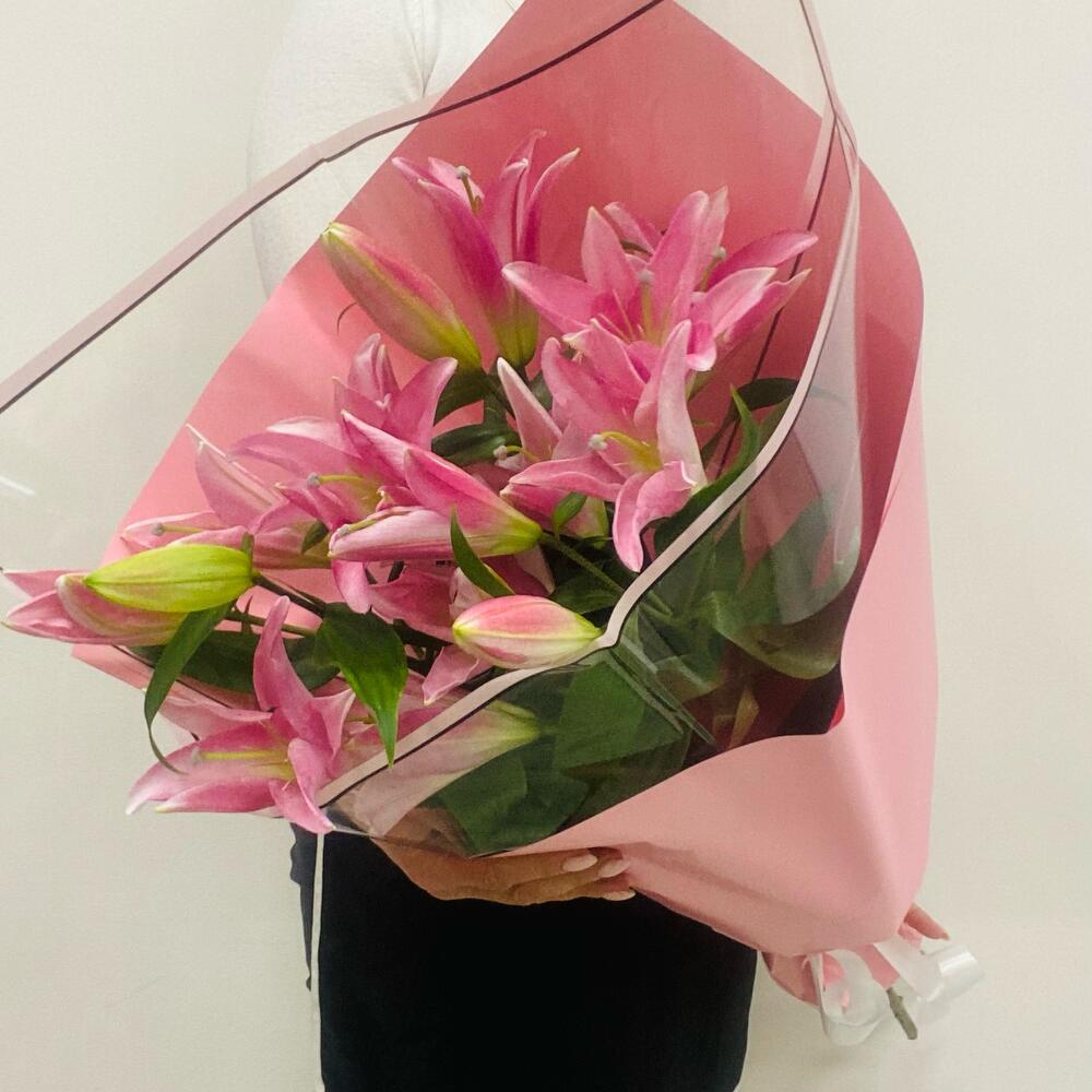 Лилия розовая – 3 шт.Упаковка дизайнерская – 2 шт.Лента – 1 шт.