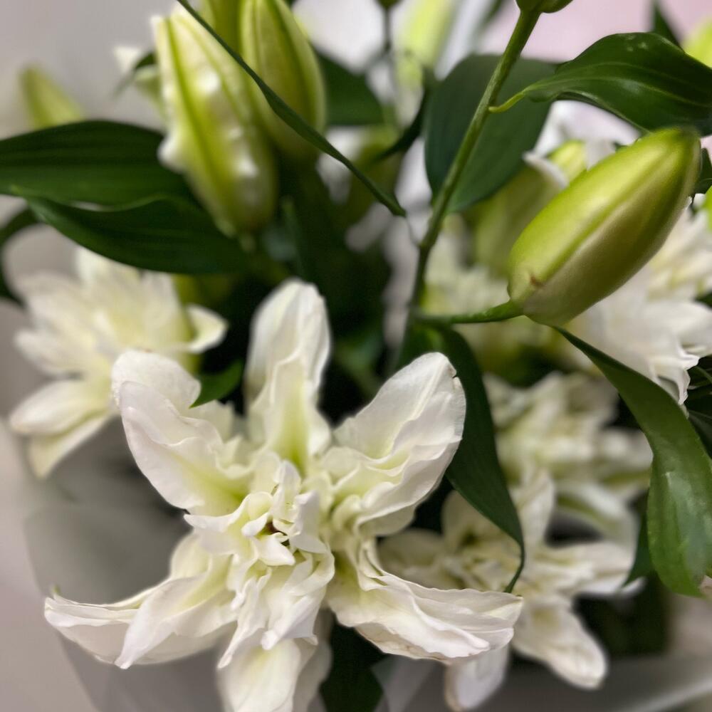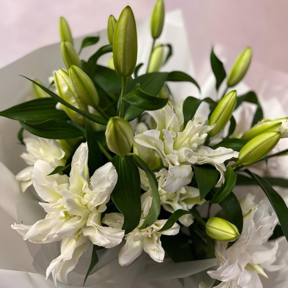 Лилия белая – 7 шт.декоративная упаковка – 1 шт.Атласная лента – 1 шт.