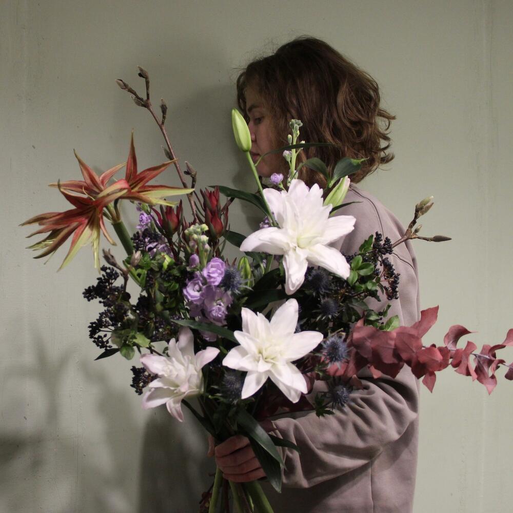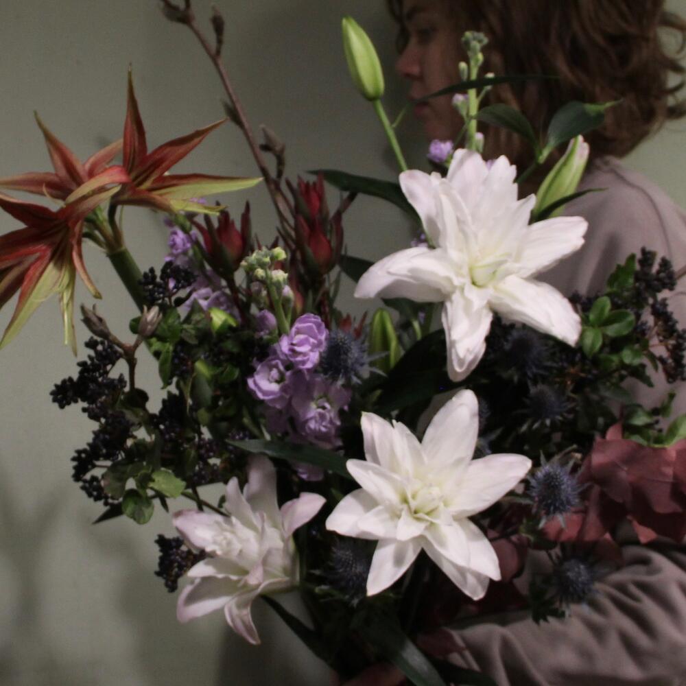 Лилия махровая – 3 шт.Амариллис – 1 шт.левкадендрон – 1 шт.Вибурнум – 3 шт.Эрингиум – 1 шт.Маттиола – 3 шт.магнолия ветка – 2 шт.эвкалипт стабилизируемый – 2 шт.Лента – 1 шт.