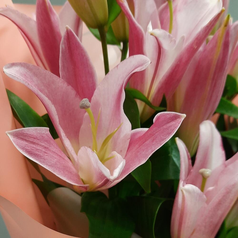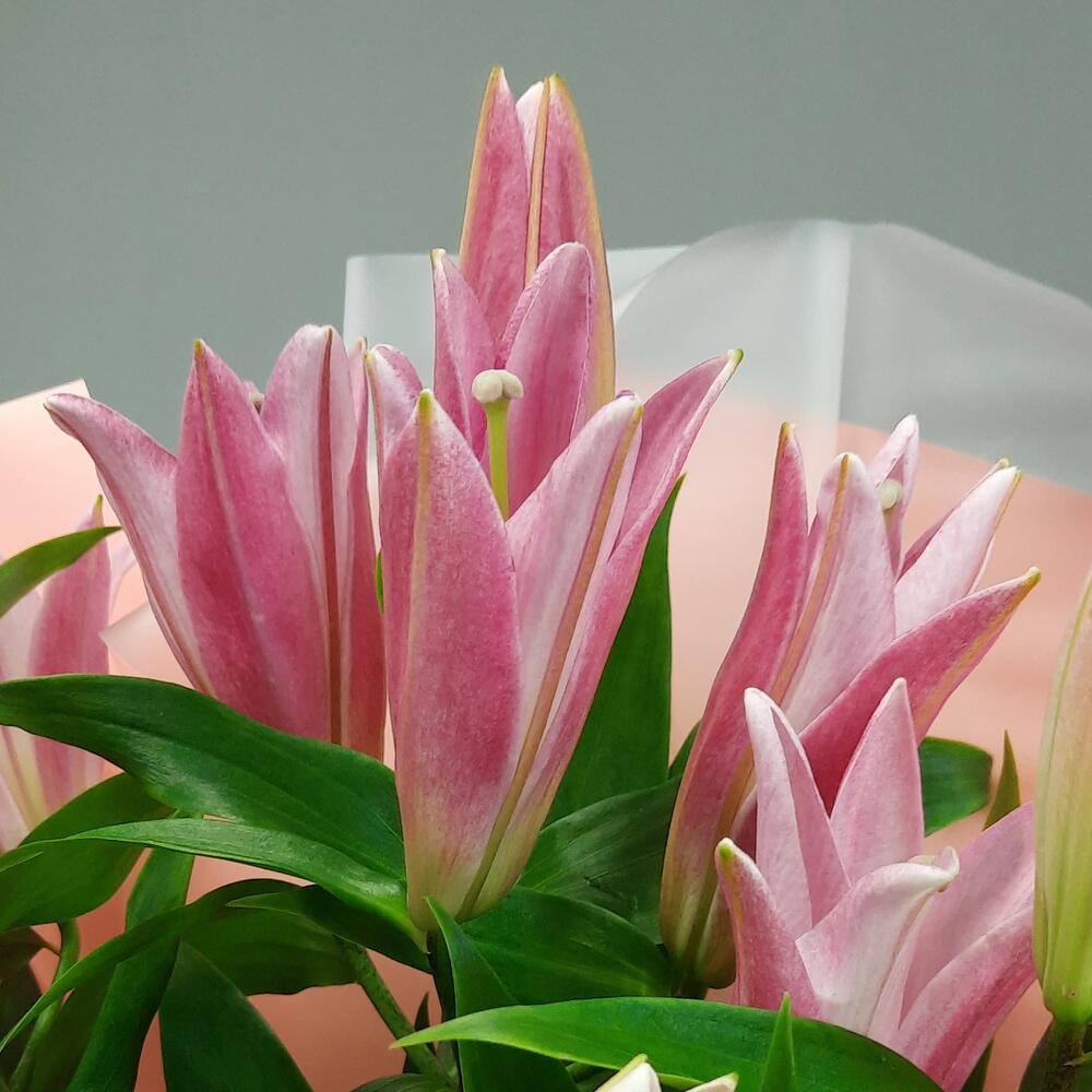 Лента атласная – 2 шт.Упаковка дизайнерская – 5 шт.лилия розовая ароматная – 5 шт.