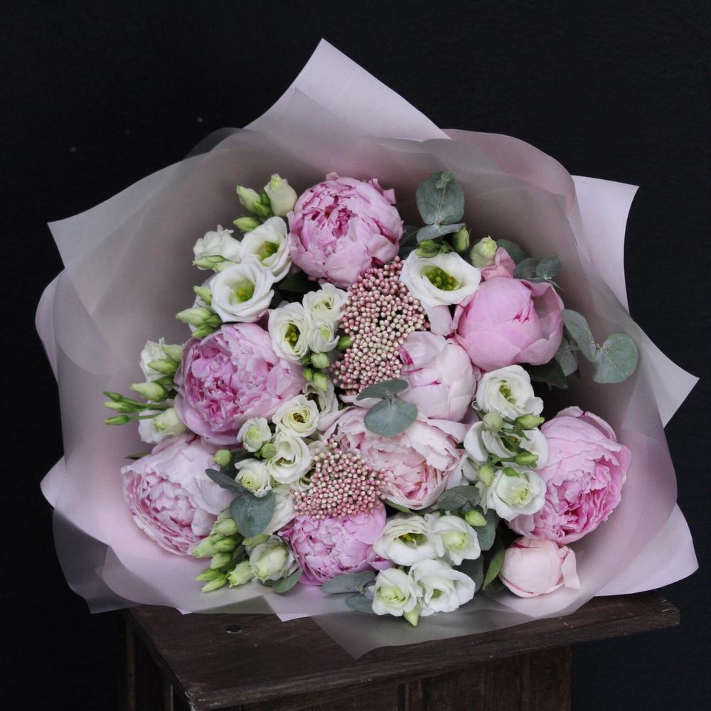 Озотамнус – 2 шт.Эвкалипт – 3 шт.Эустома – 5 шт.Лента атласная – 2 шт.Пион Сара Бернар – 9 шт.Пленка дизайнерская – 5 шт.