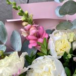 Маттиола – 7 шт.Эвкалипт – 5 шт.Лента атласная – 1 шт.Самшит – 8 шт.Пион белый Дюшес – 5 шт.Дизайнерская упаковка – 4 шт.лизиантус розовый махровый – 5 шт.