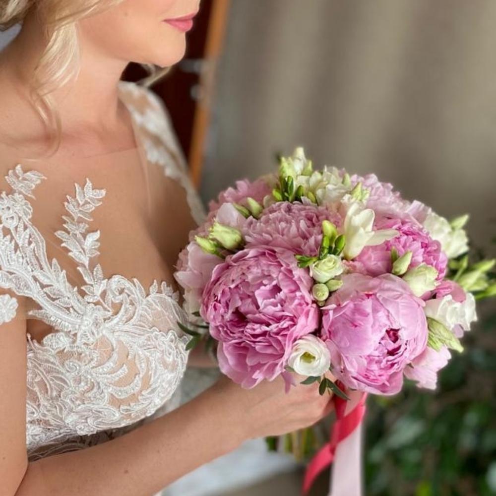 Лизиантус – 6 шт.Лента атласная – 4 шт.Пион Сара Бернар – 11 шт.Фрезия белая – 8 шт.Эвкалипт парвифолия – 4 шт.бутоньерка мужская – 1 шт.