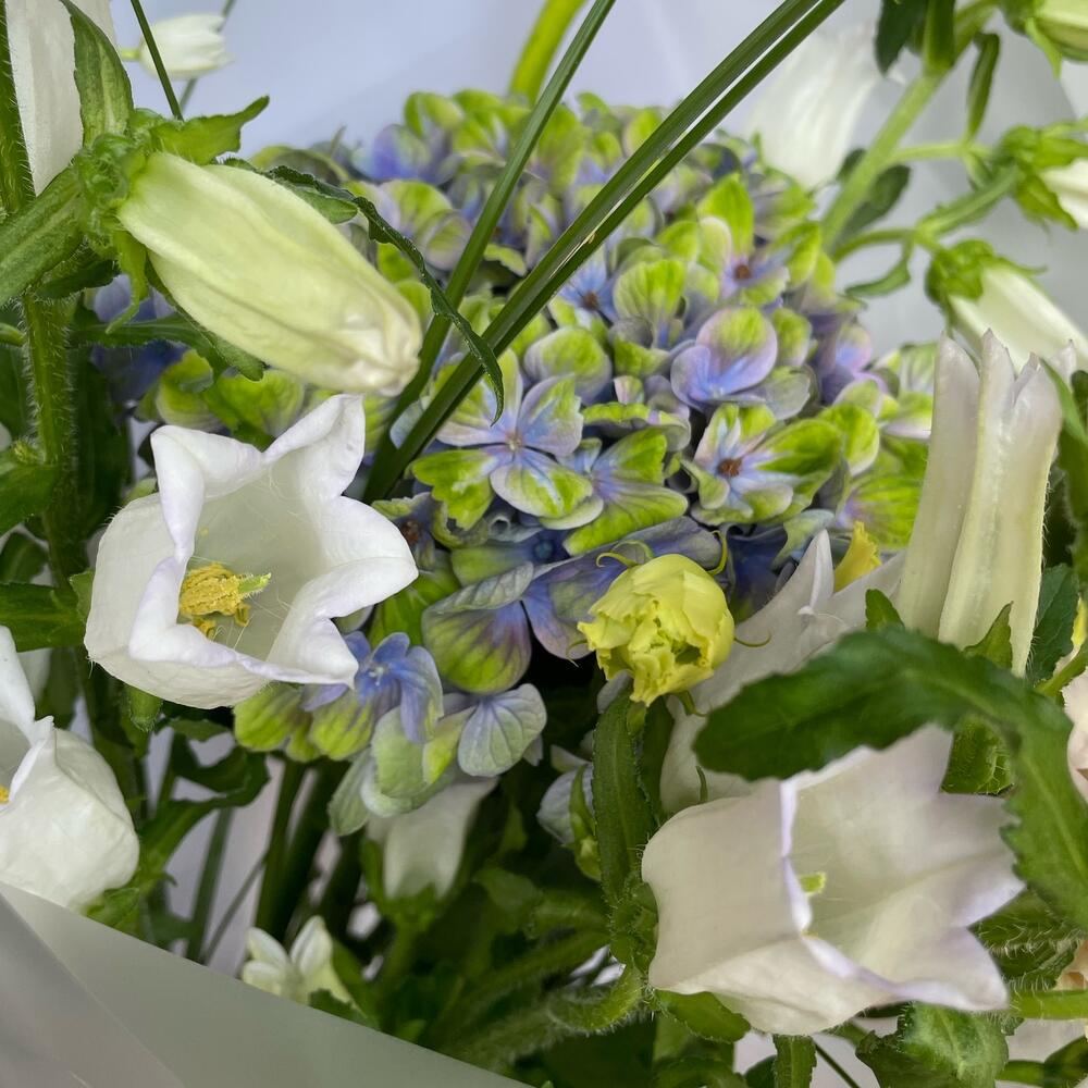Гортензия – 1 шт.Кампанула – 3 шт.Упаковка – 1 шт.Эустома – 1 шт.Лента атласная – 1 шт.Орнитогалум – 2 шт.зелень сезонная микс – 2 шт.