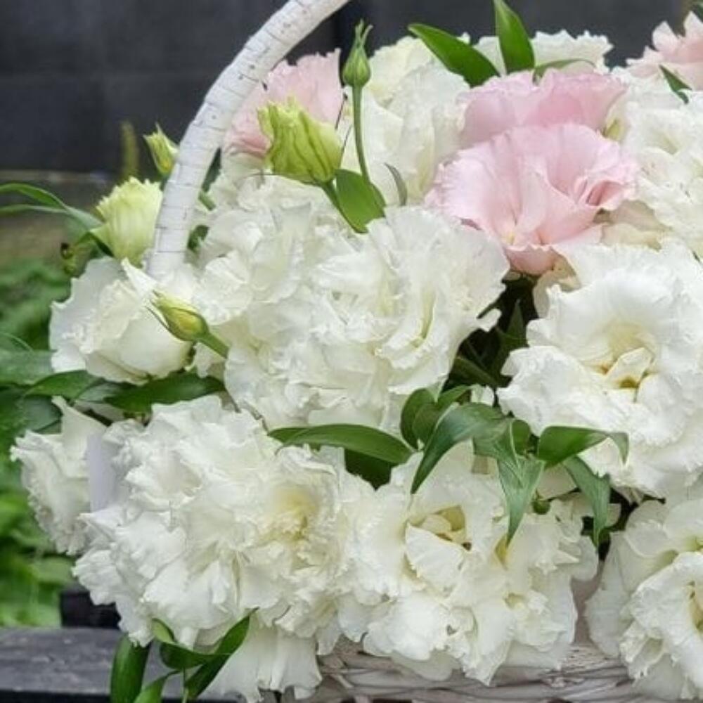 Лизиантус – 19 шт.Оазис флористический – 2 шт.Фисташка пучок – 1 шт.Корзина плетеная – 1 шт.