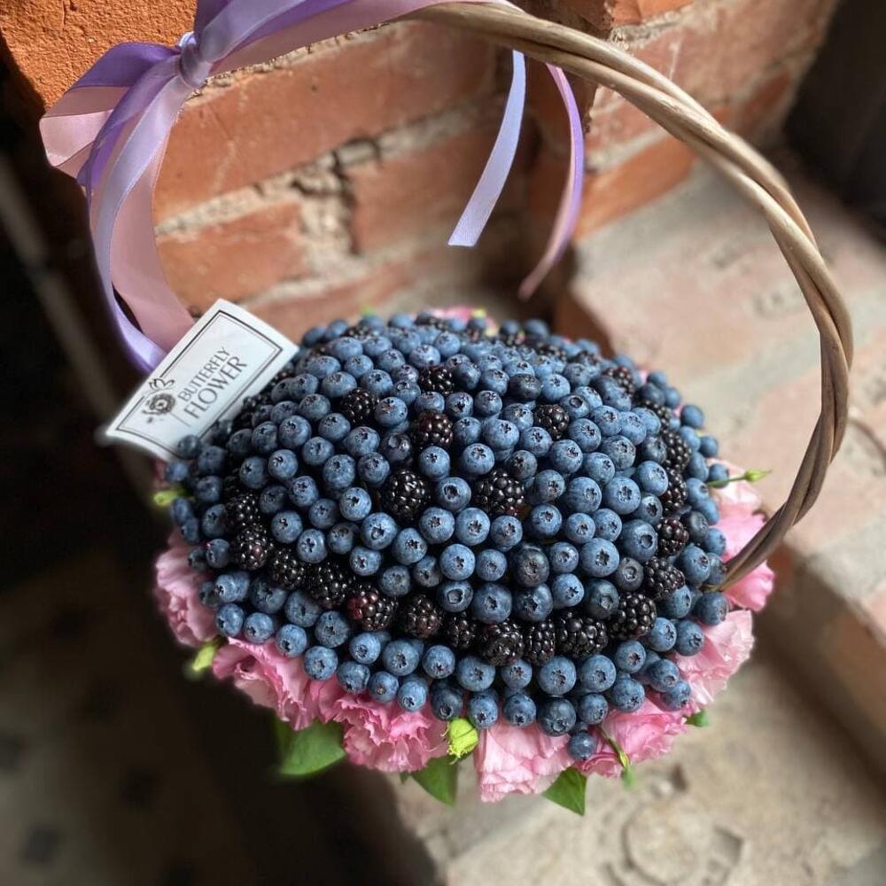 Корзина – 1 шт.Упаковка – 1 шт.Эустома – 5 шт.Оазис – 1 шт.Ежевика – 250 гр.Голубика – 750 гр.