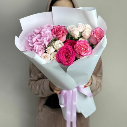 Авторский букет из розовых Пионовидных Роз и Эвкалипта