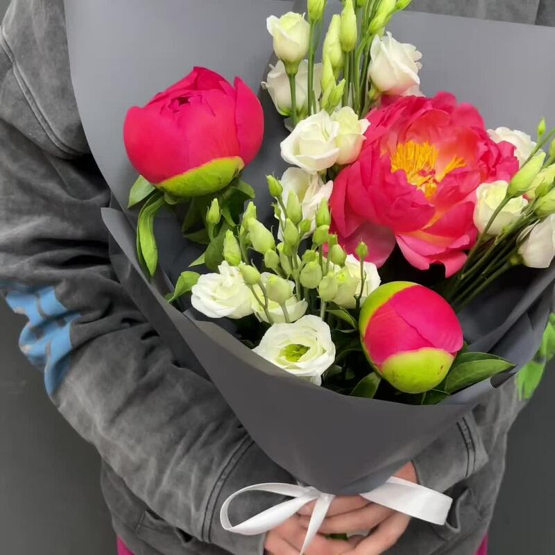 Лизиантус белый – 3 шт.Лента атласная белая – 1 шт.Упаковка корейская пленка – 1 шт.премиум пион Коралл шарм – 3 шт.