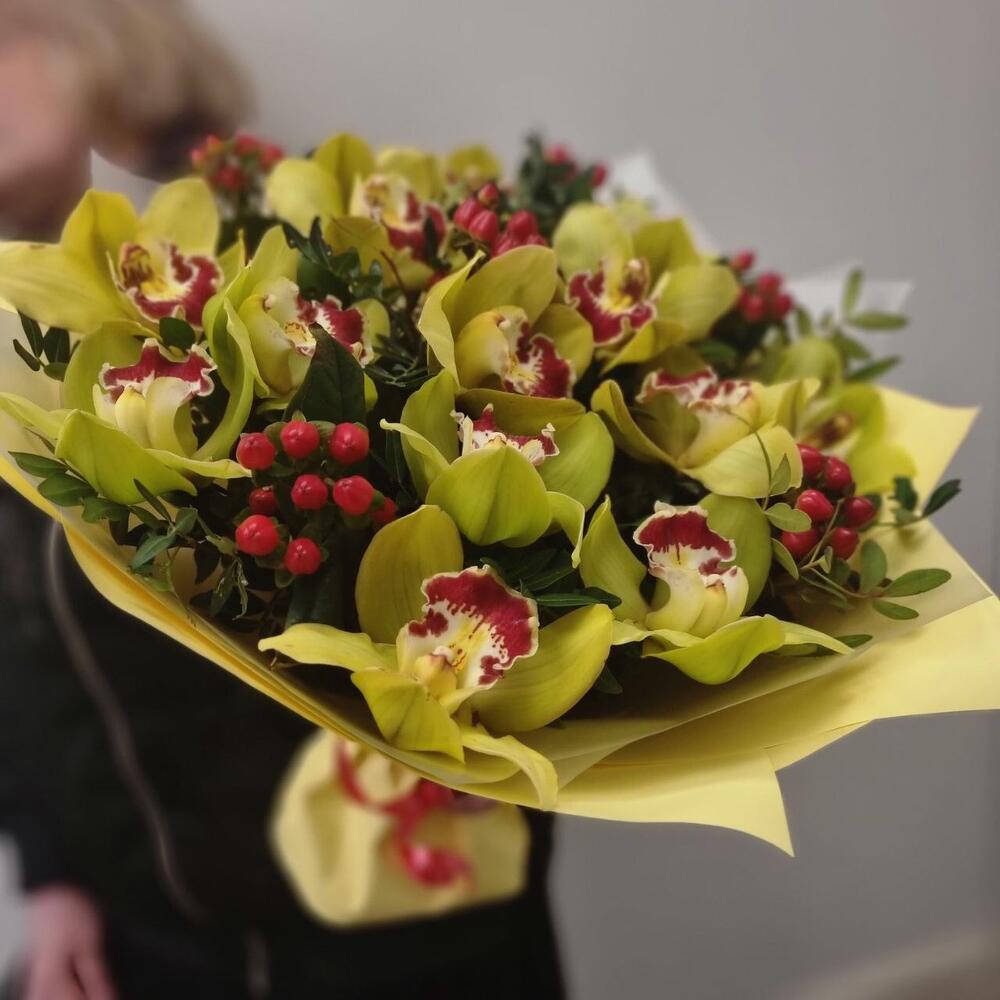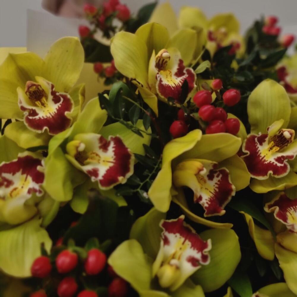 Орхидея Цимбидиум – 13 шт.Хиперикум – 6 шт.Фисташка – 5 шт.Упаковка дизайнерская – 2 шт.
