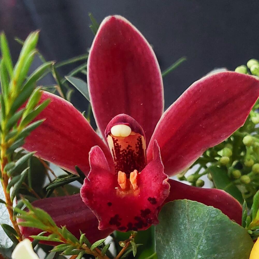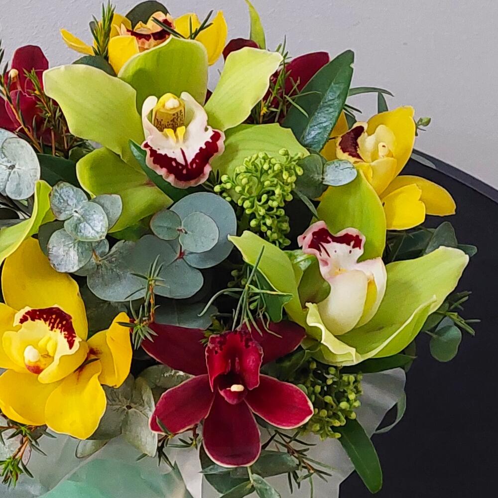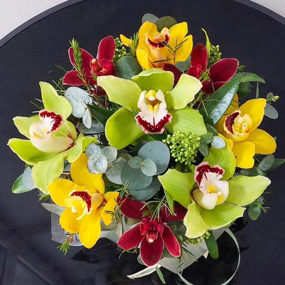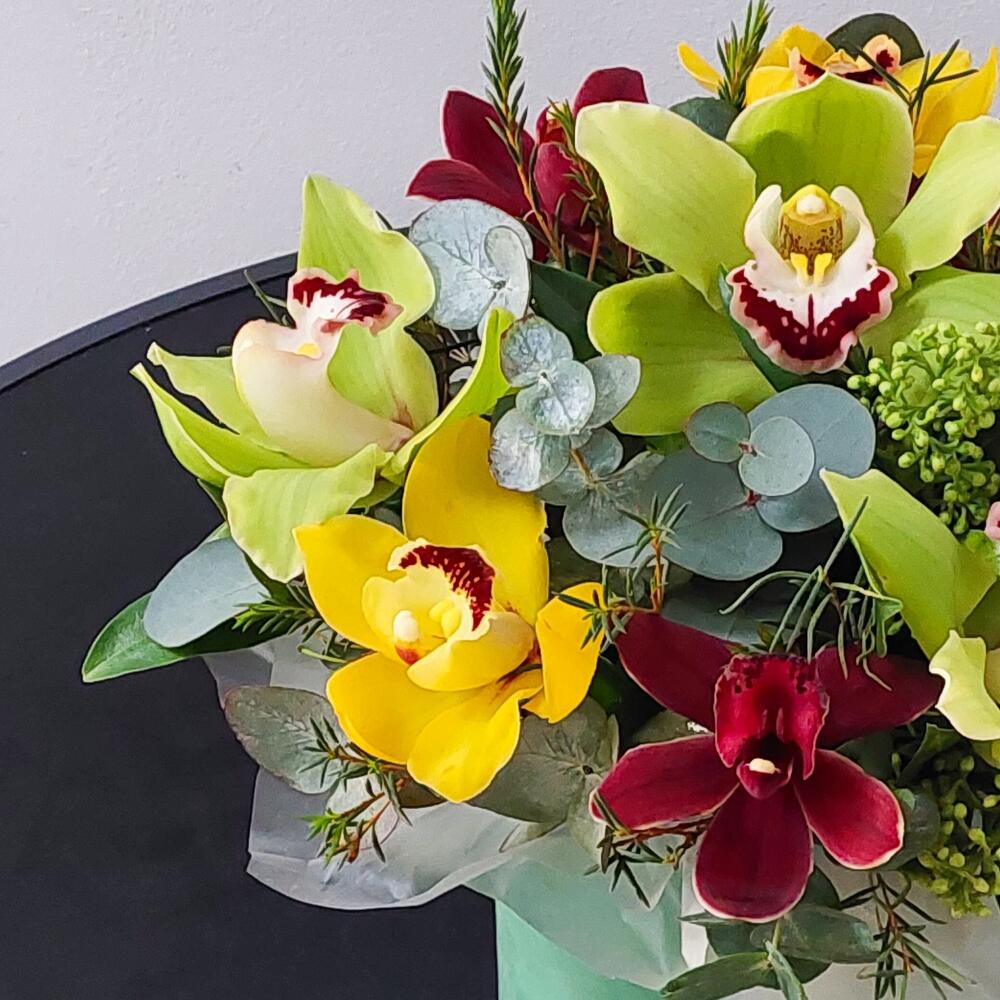 Лента атласная – 2 шт.Скиммия – 5 шт.Коробка шляпная бархатная – 1 шт.Пленка матовая – 1 шт.Орхидея цимбидиум желтая – 3 шт.Открыточка с вашими пожеланиями – 1 шт.Орхидея цимбидиум фисташковая – 3 шт.Оазис флористический – 1 шт.Эвкалипт Baby Blue – 5 шт.орхидея цимбидиум красная – 3 шт.