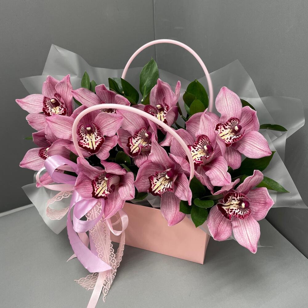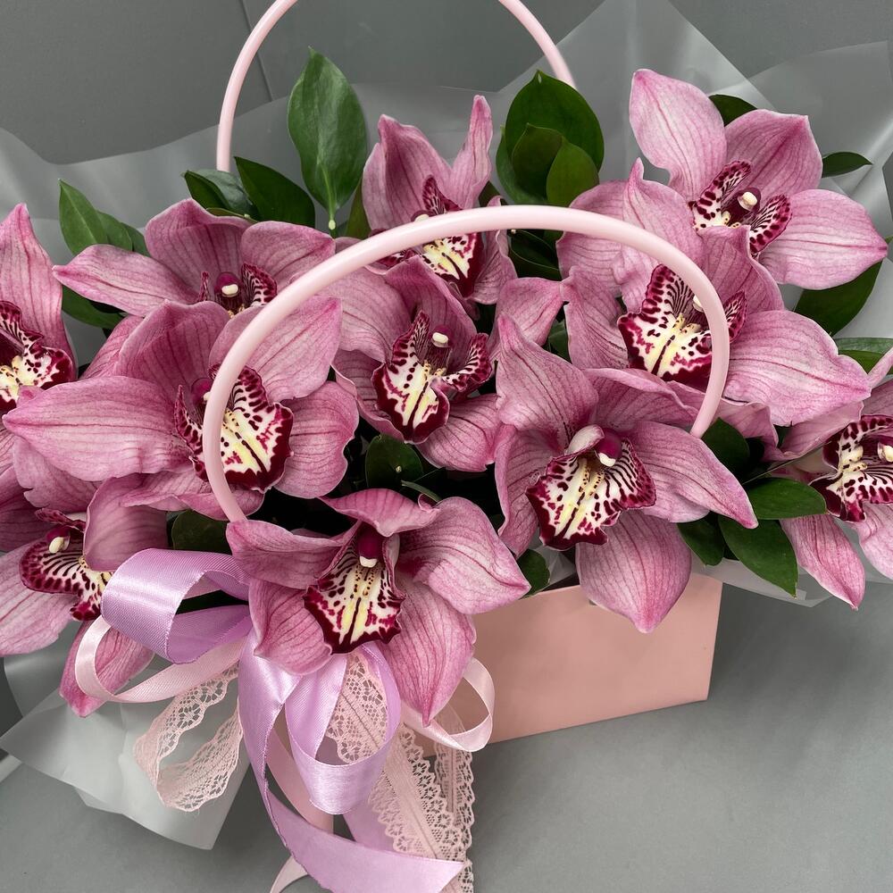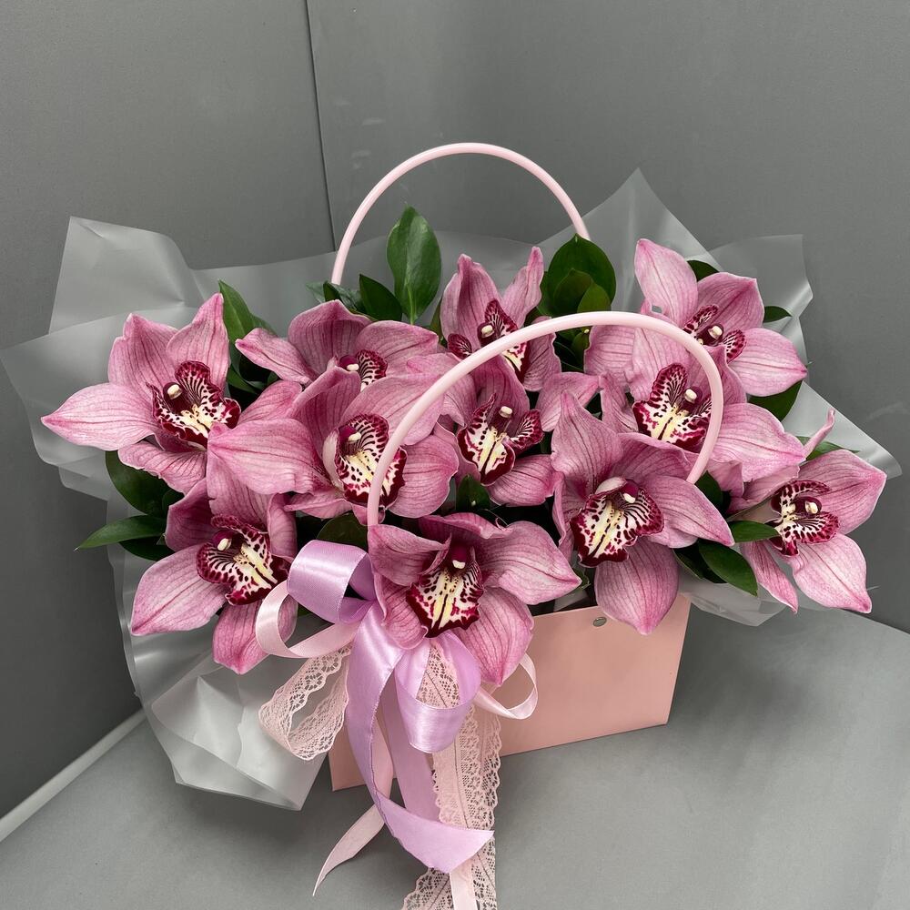 Орхидеи – 11 шт.Рускус – 6 шт.оазис флористический с водой – 1 шт.Сумочка – 1 шт.Оформление лента атласная – 1 шт.оформление лента кружево – 1 шт.