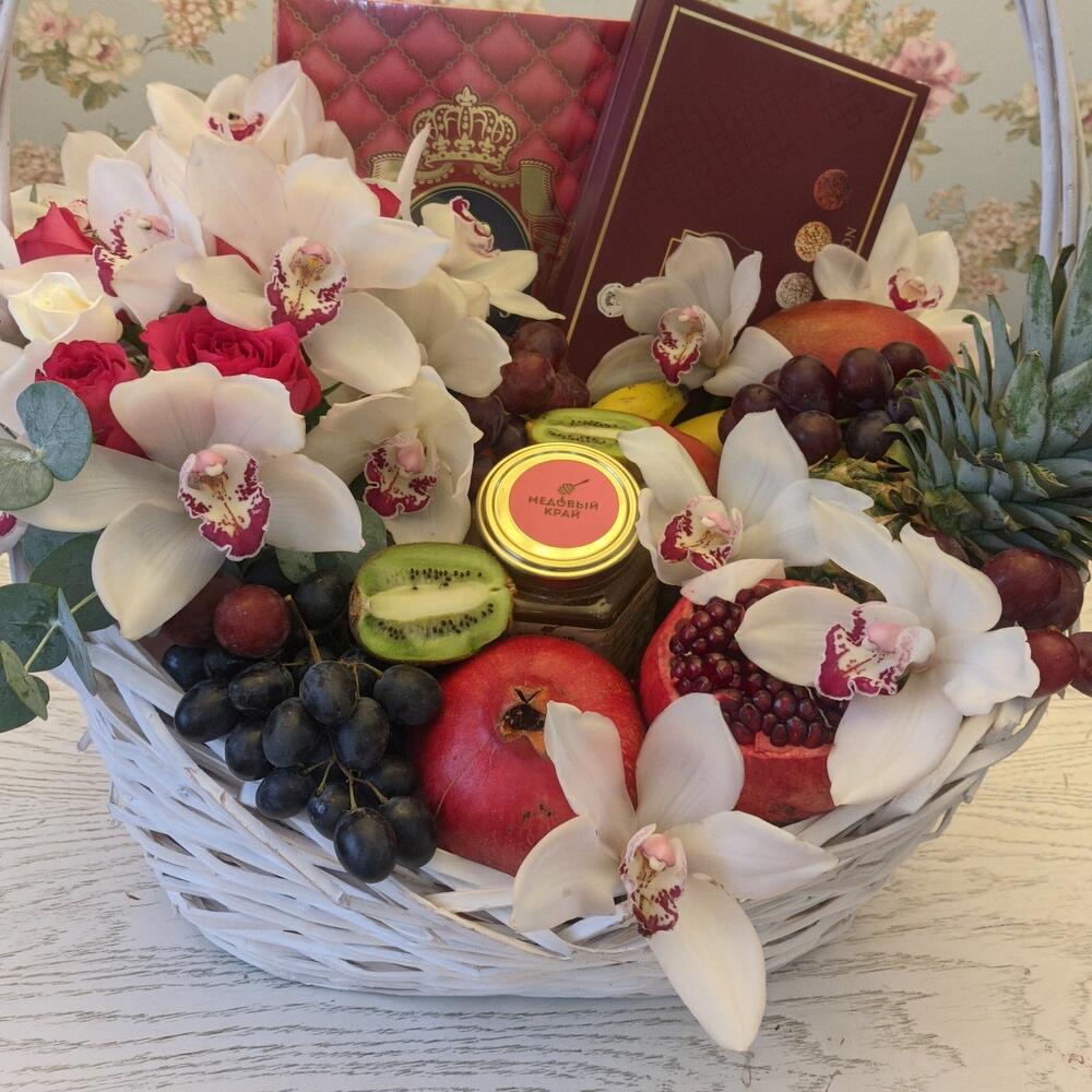 Шикарная корзина с орхидеями и розами, с миксом фруктов , чая, меда, конфеты и сухофруктов, орехов. Супер подарок для VIP персон.Закажи , сделаем и доставим.