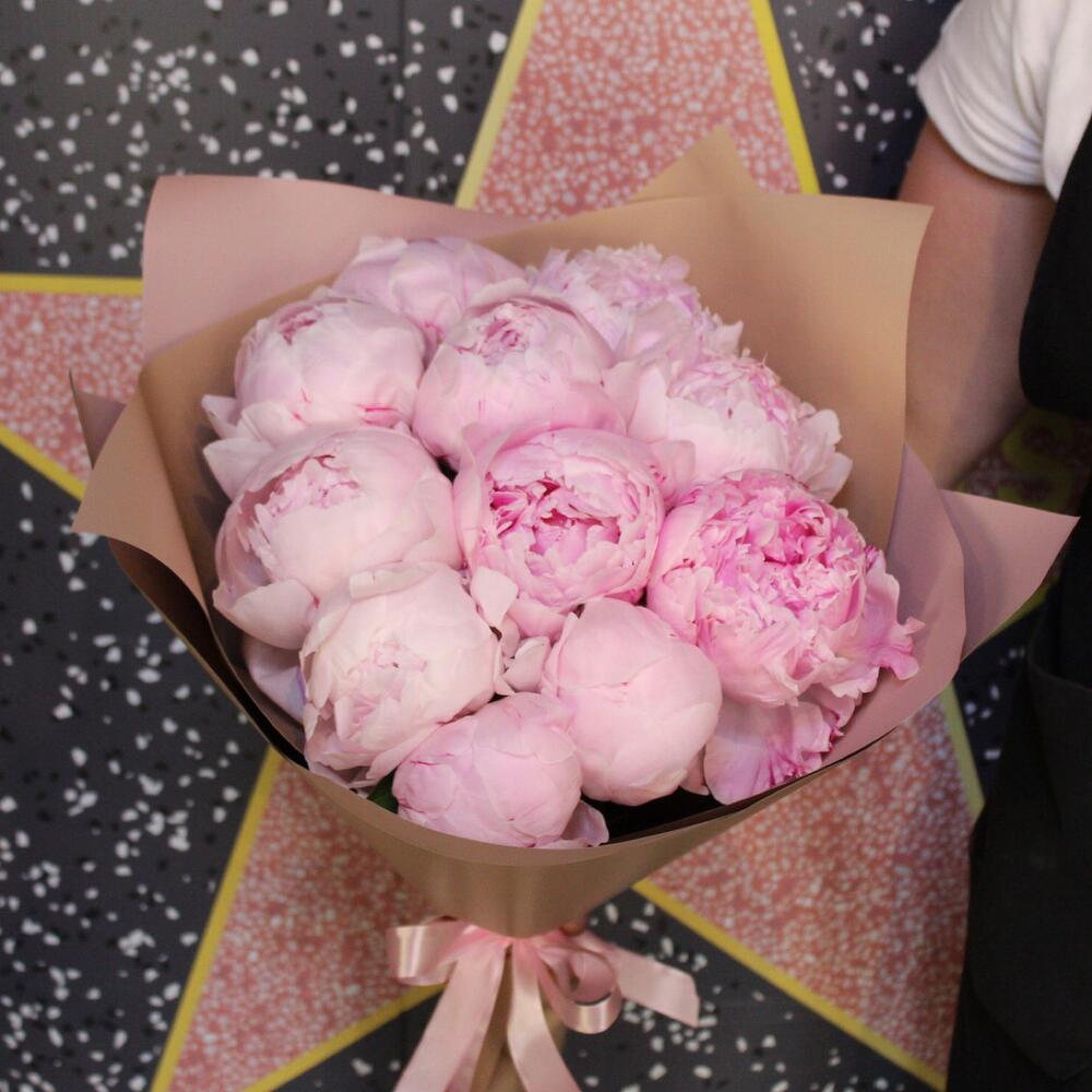 Лента атласная – 1 шт.Пион Сара Бернар – 11 шт.Пленка дизайнерская – 3 шт.