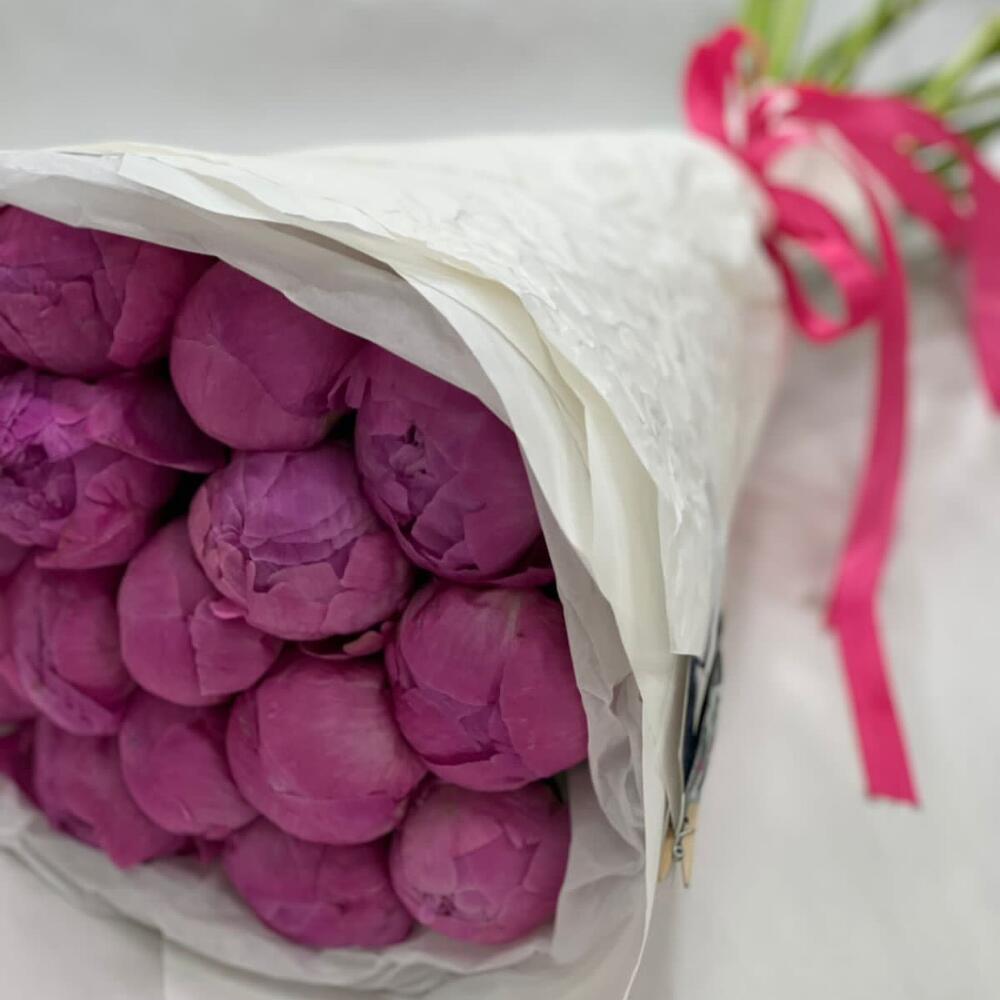 Упаковка – 2 шт.Лента атласная – 1 шт.пион ярко розовый премиум – 17 шт.