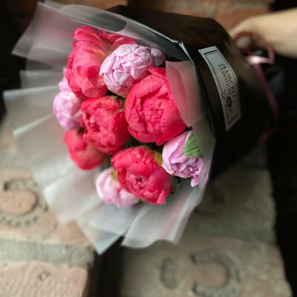 Букет из 9 коралловых и розовых пионов в дизайнерской упаковке "Рафаэль"
