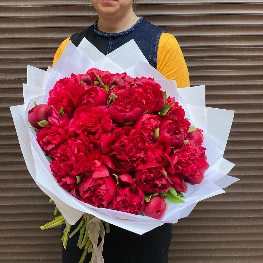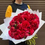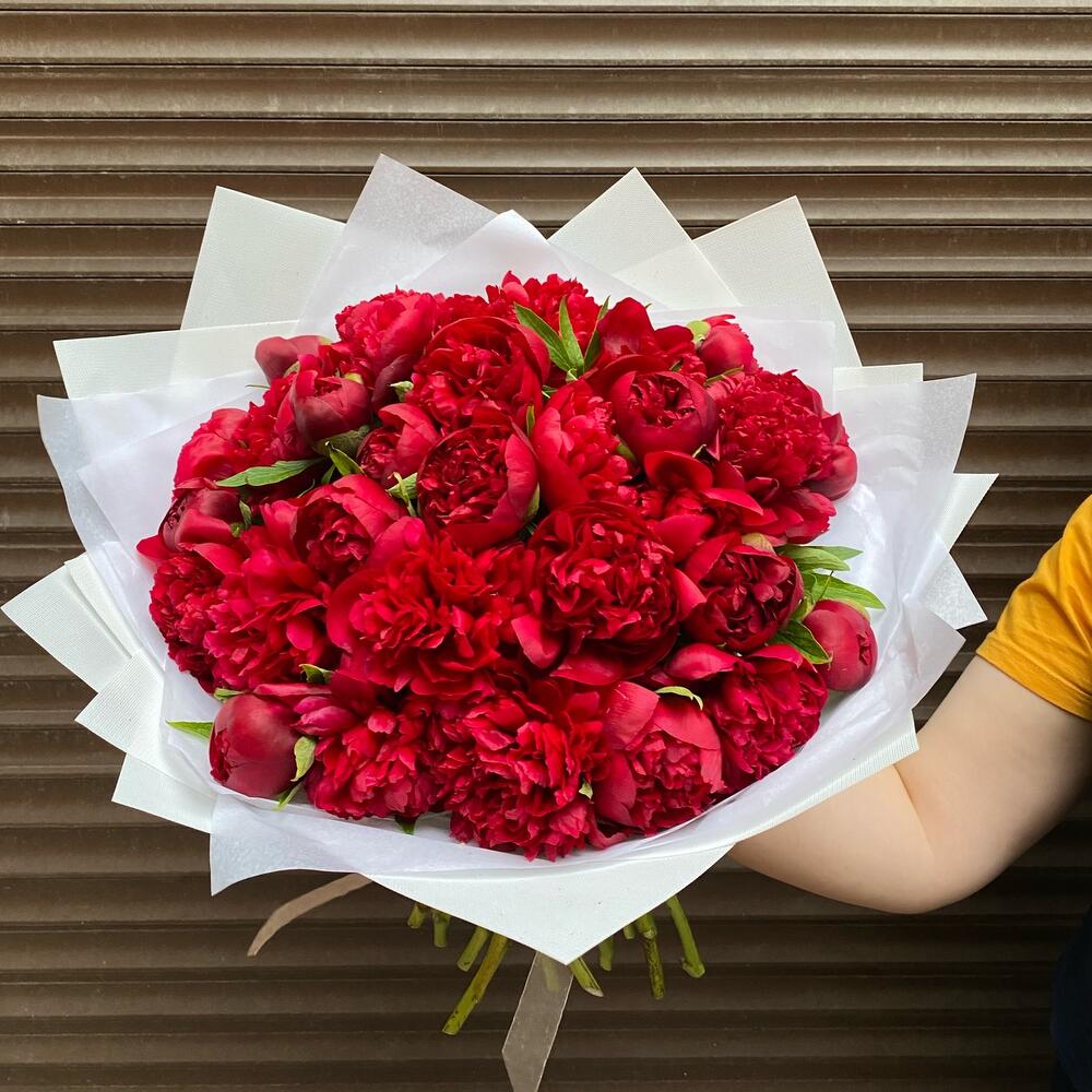 Лента атласная – 1 шт.Пион красный – 35 шт.Тишью белое – 2 шт.Пленка дизайнерская – 3 шт.