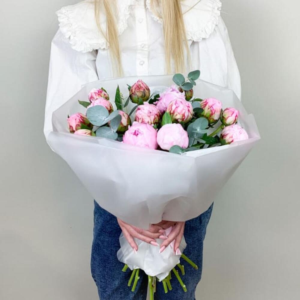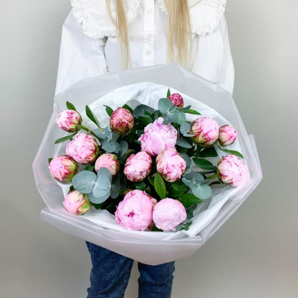 Букет из розовых пионов Premium 11 шт с эвкалиптом