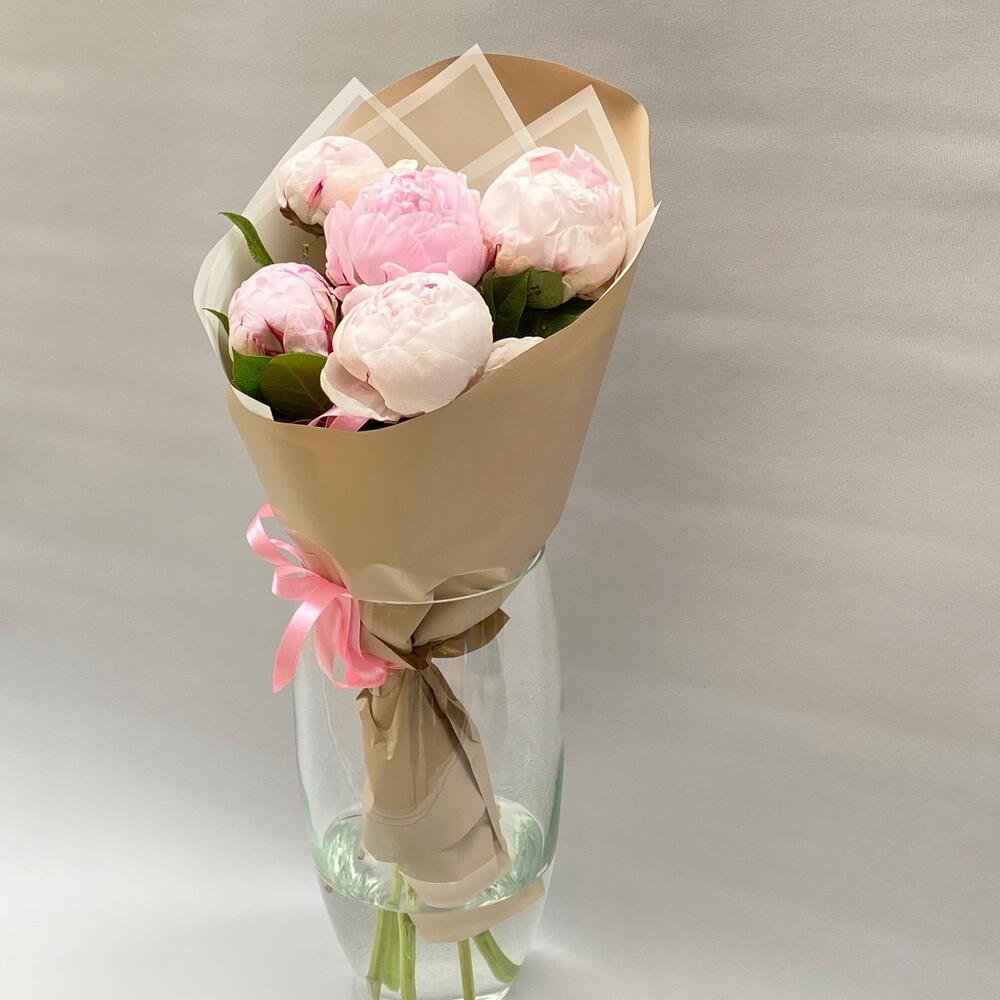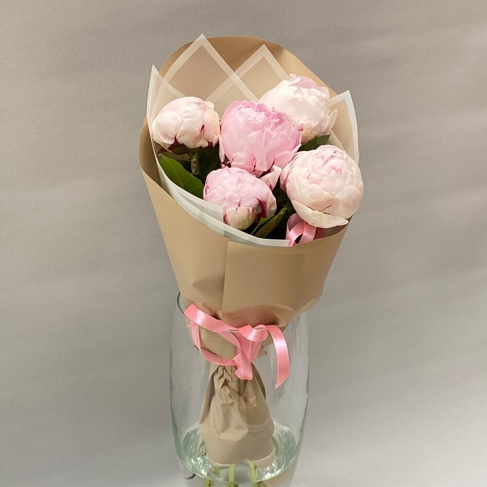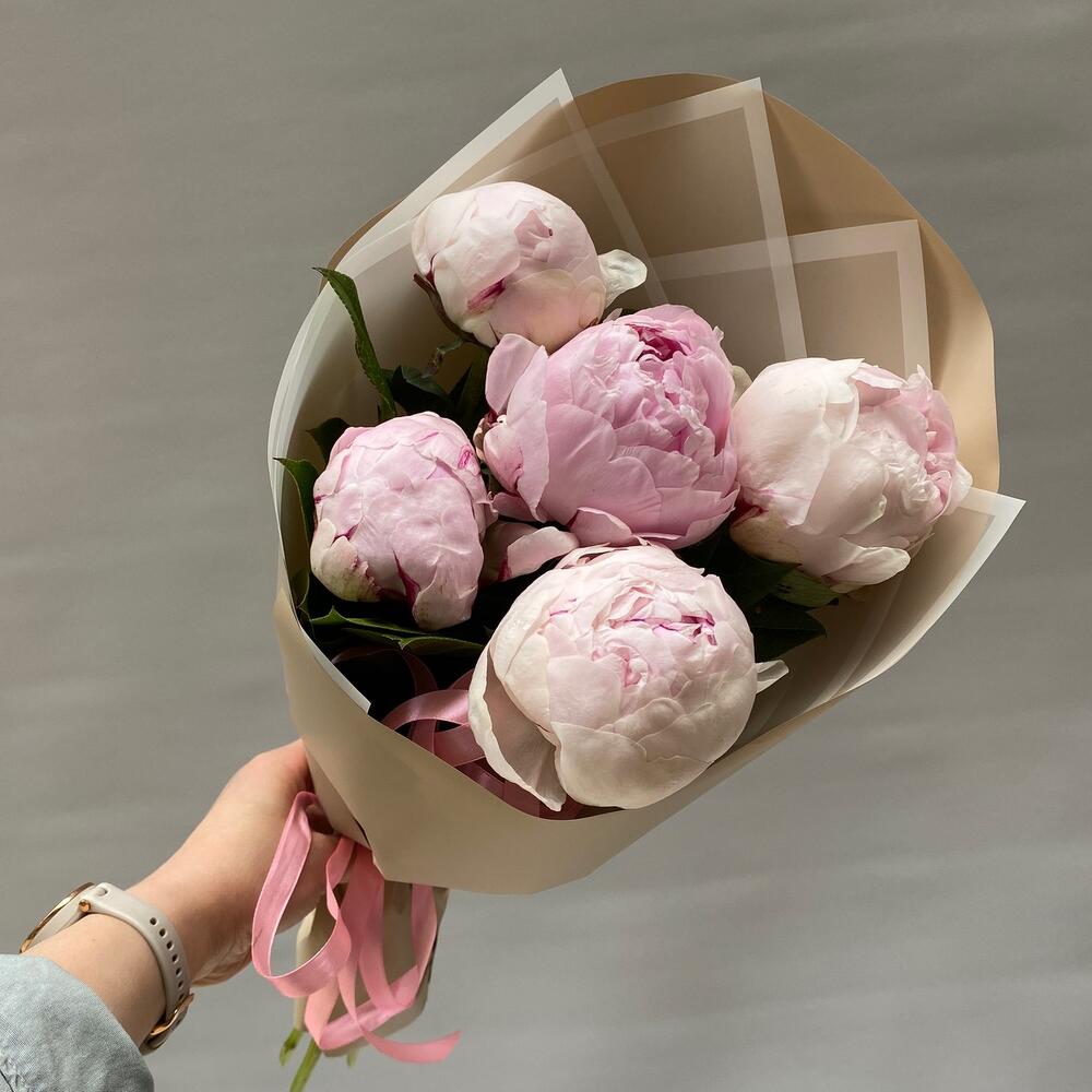 Лента атласная – 1 шт.Упаковка дизайнерская – 1 шт.пионы розовые премиум сара бернар – 5 шт.