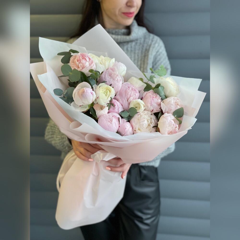 Пион розовый – 12 шт. Ранункулюс (белый) – 7 шт. Эвкалипт – 1 шт. Упаковка дизайнерская – 1 шт.