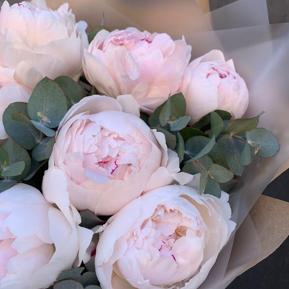 Пион – 7 шт.Эвкалипт – 10 шт.Упаковка дизайнерская – 2 шт.Лента атласная – 1 шт.
