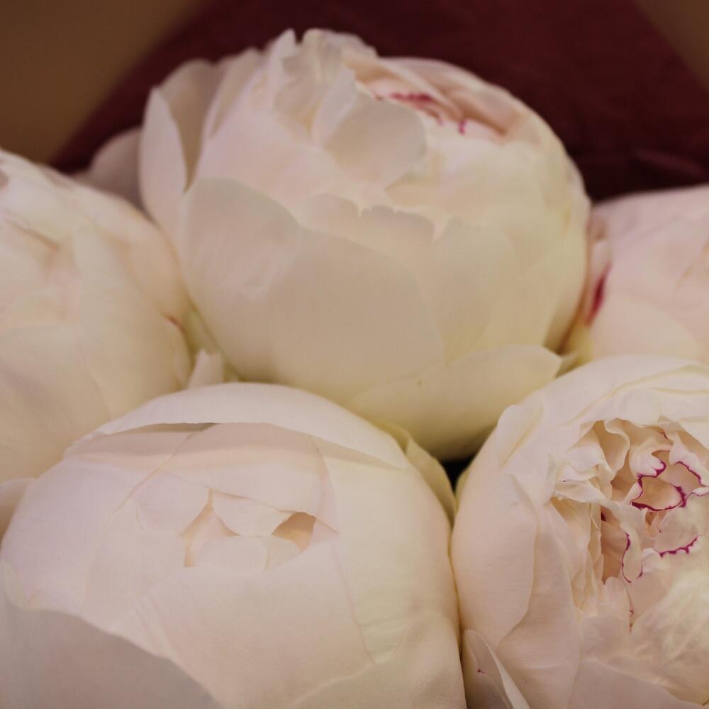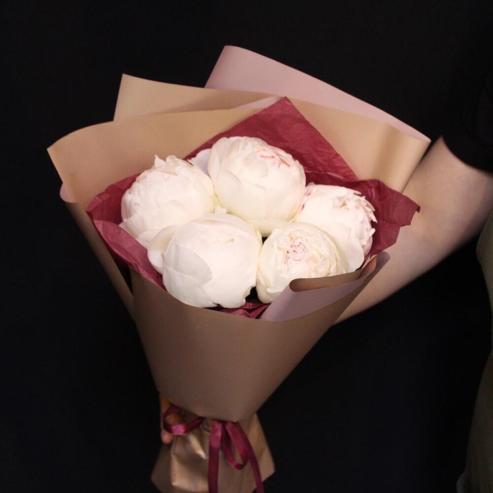 Лента атласная – 1 шт.Пленка дизайнерская – 3 шт.пионы белые – 5 шт.