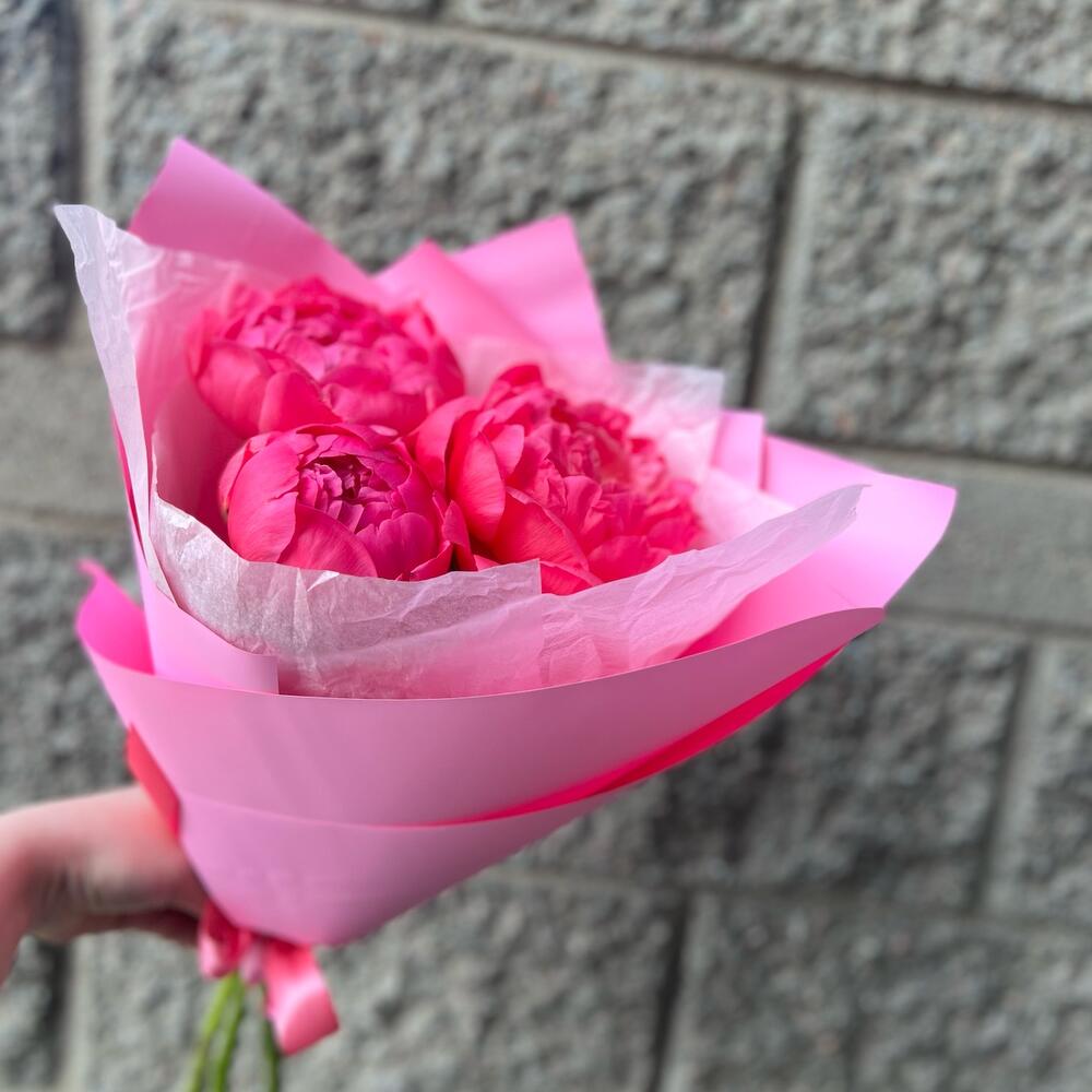 Лента атласная – 1 шт.Фисташка – 1 шт.Упаковка дизайнерская – 3 шт.Пион коралл шарм – 3 шт.
