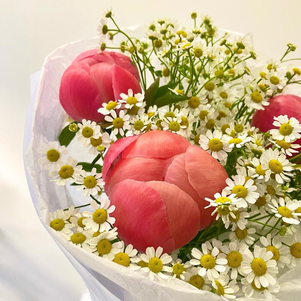 Пион коралл шарм – 3 шт.Матрикария – 5 шт.Упаковка дизайнерская – 1 шт.
