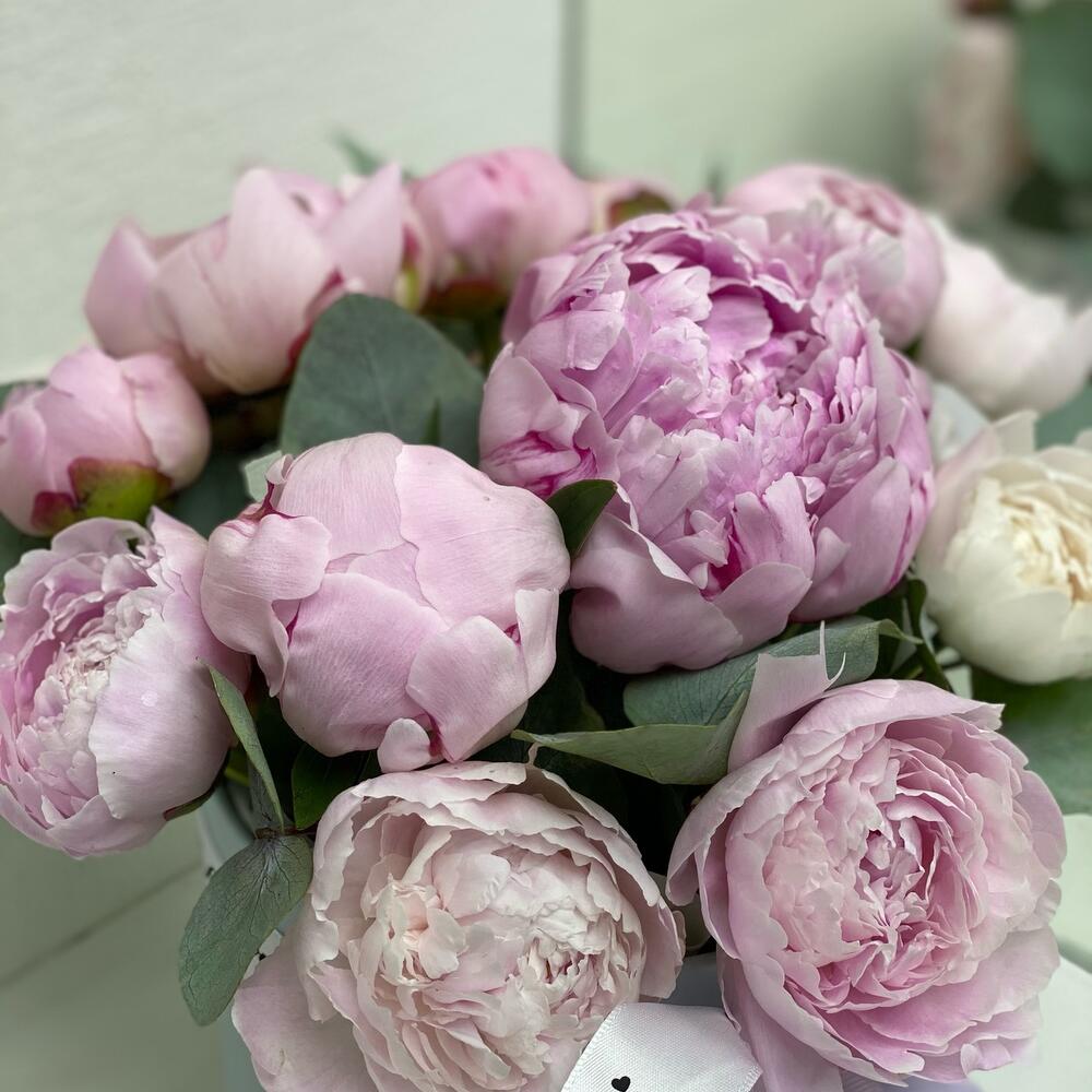 Лента – 2 шт.Зелень – 5 шт.Оазис – 1 шт.Коробка – 1 шт.пионы – 13 шт.