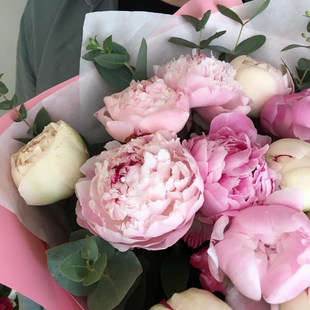 Роскошный букет из нежно розовых и сливочных пионов, 15 штук с веточками ароматного эвкалипта, в дизайнерской упаковке.Высота пионов шестьдесят сантиметров, ширина букета сорок сантиметров.Пышный и нежный букет пионов никого не оставит равнодушным.Стильное цветочное решение для любого случая.Отличный выбор для подарка на день всех влюблённых, 14 февраля.