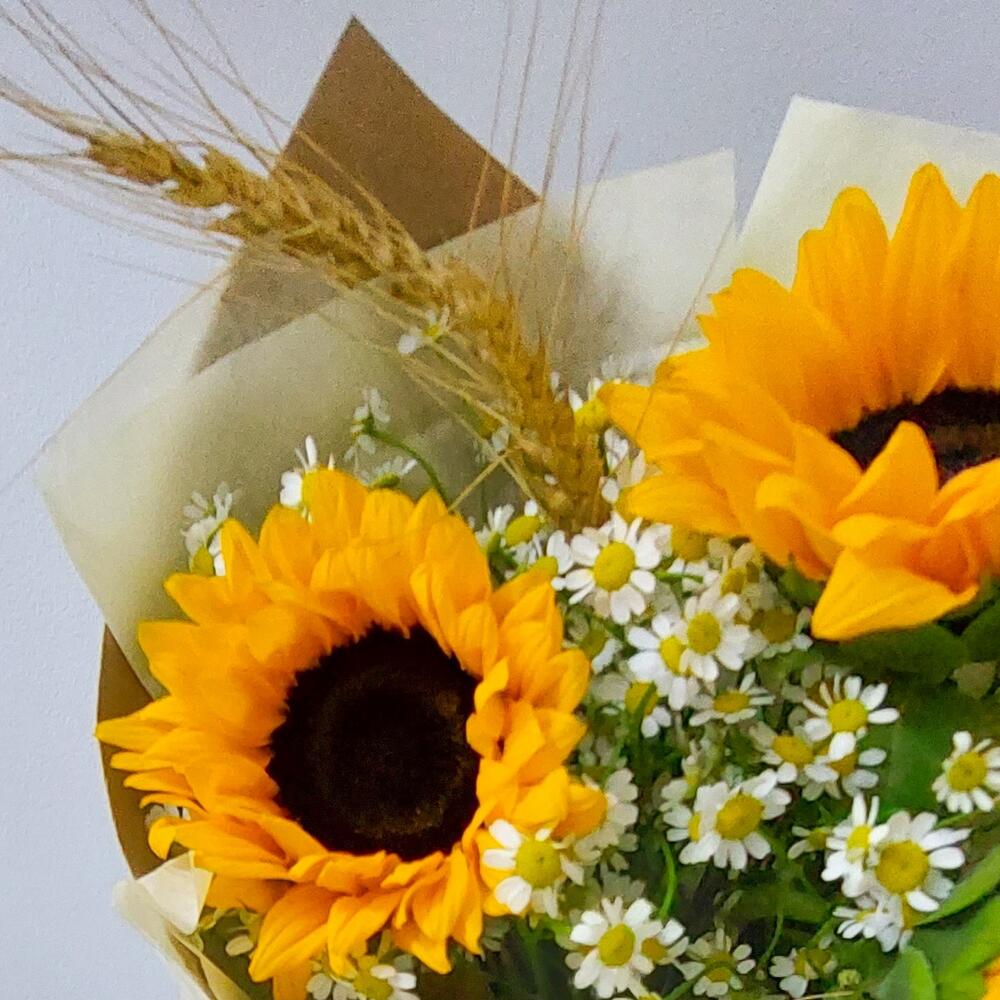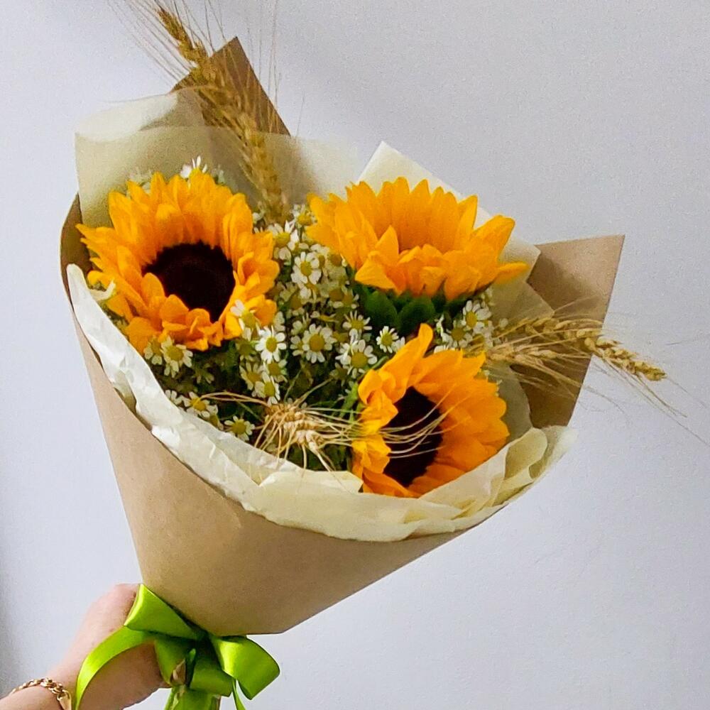 Лента атласная – 2 шт.Тишью – 1 шт.Подсолнух Голландский – 3 шт.Открыточка с вашими пожеланиями – 1 шт.бумага крафт – 1 шт.транспортировочная упаковка – 1 шт.пшеница натуральная – 5 шт.танацетум ромашка – 5 шт.