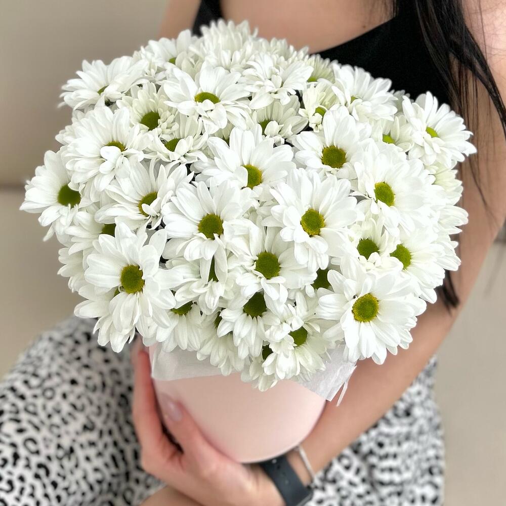 Тишью – 1 шт.Коробка шляпная – 1 шт.Ромашка кустовая – 5 шт.Оазис флористический – 1 шт.