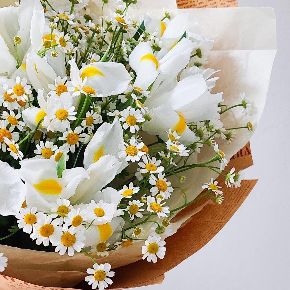 Лента атласная – 1 шт.Тишью – 2 шт.Ирис белый – 9 шт.Открыточка с вашими пожеланиями – 1 шт.бумага крафт – 1 шт.транспортировочная упаковка – 1 шт.ромашка (танацетум) – 8 шт.