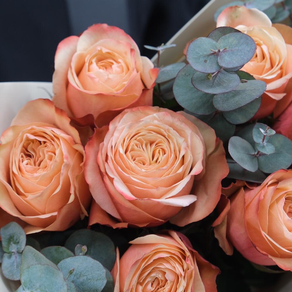 15 пионовидных роз Кахала с веточками эвкалипта