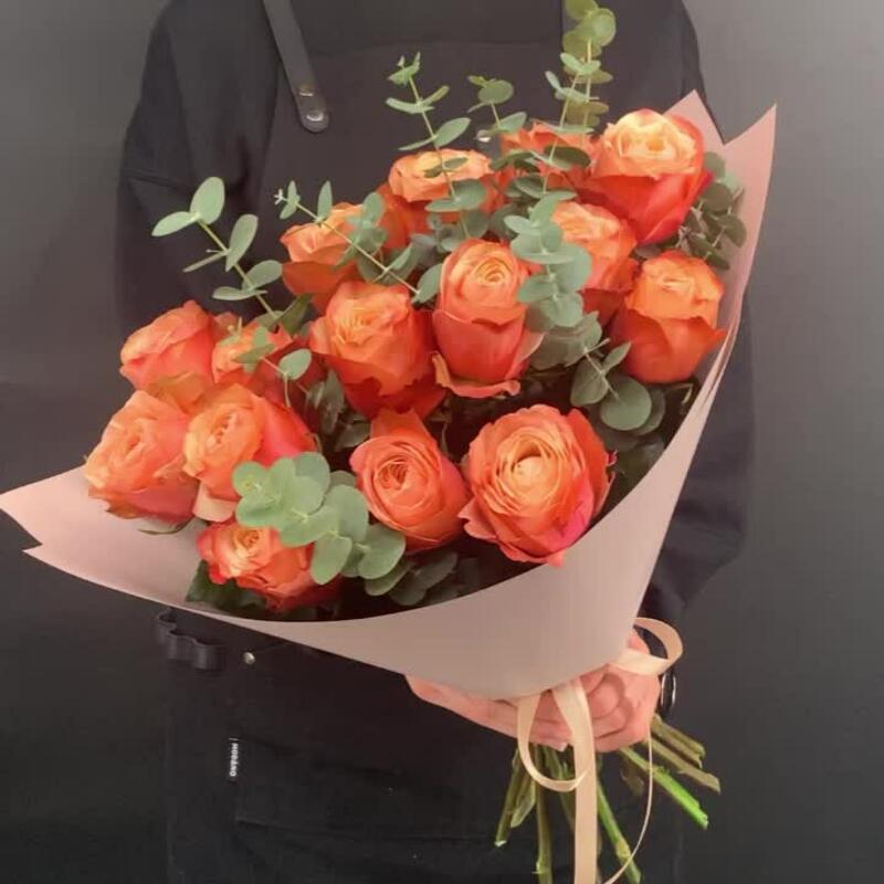 Эвкалипт – 3 шт.Роза пионовидная – 15 шт.Упаковка дизайнерская – 1 шт.Лента атласная – 1 шт.
