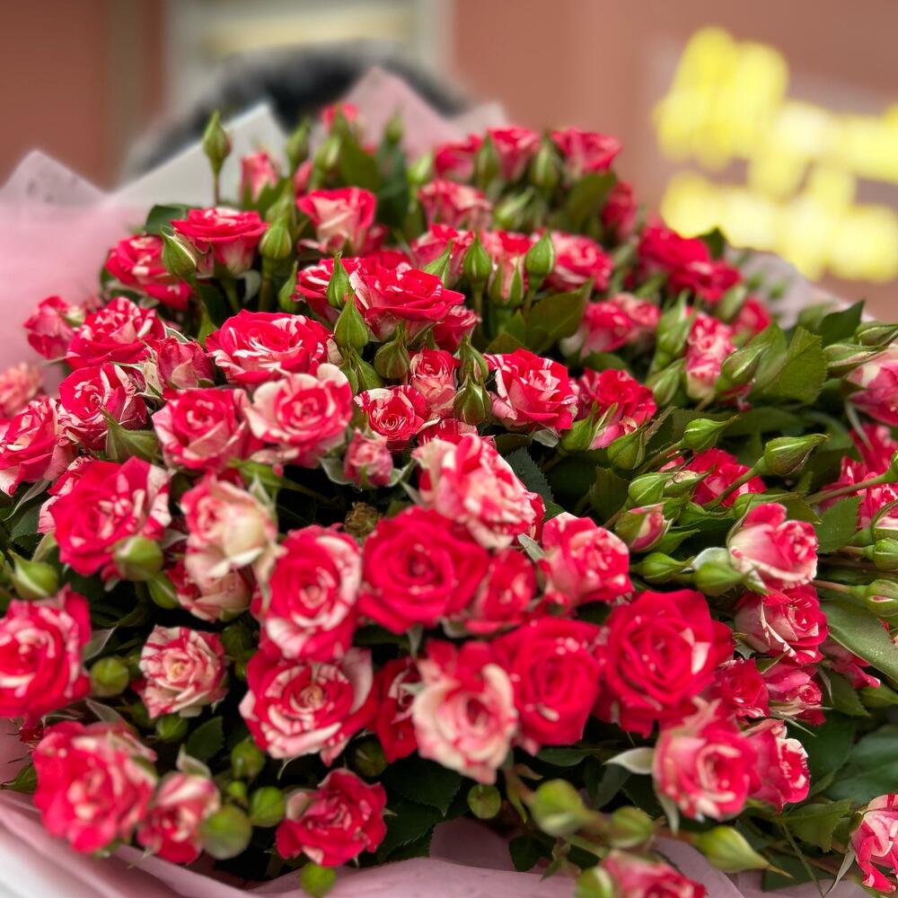 Букет из 15 веток кустовых роз сорта фаерворкс с оформлением, количество бутонов(розочек) в букете может достигать 101 штуки .