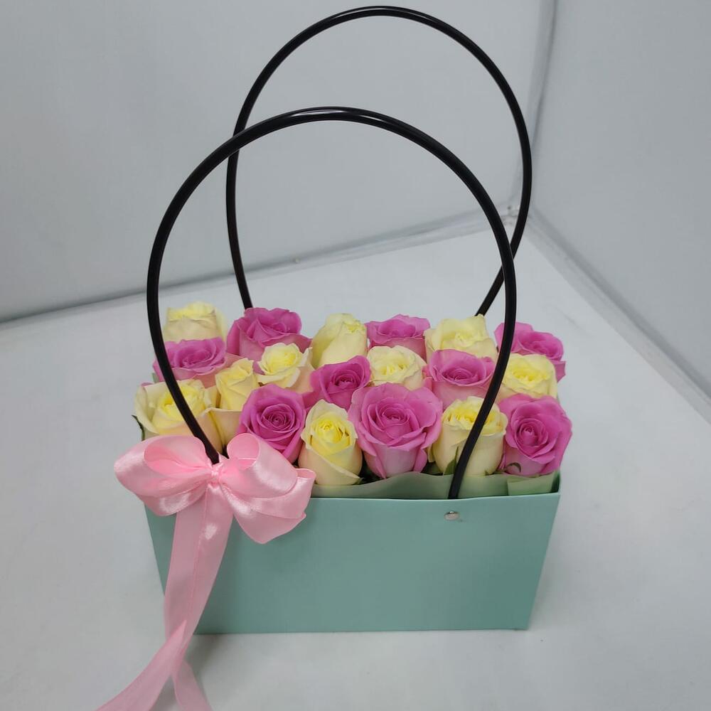 роза кения микс – 19 шт.Флористический оазис – 1 шт.Сумочка – 1 шт.