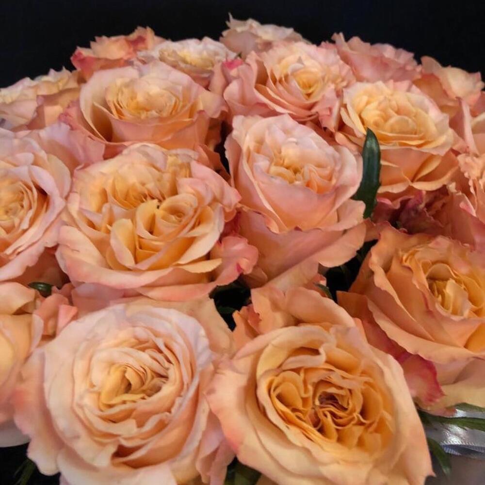 Коробка шляпная – 1 шт.Оазис флористический – 2 шт.Роза шиммер – 25 шт.