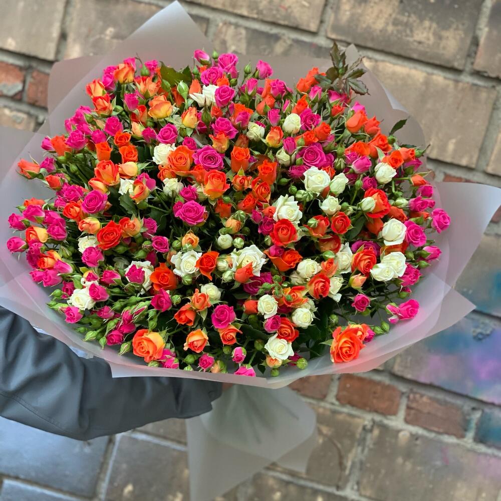 Кустовая роза – 51 шт.Лента атласная – 1 шт.Дизайнерская упаковка – 5 шт.